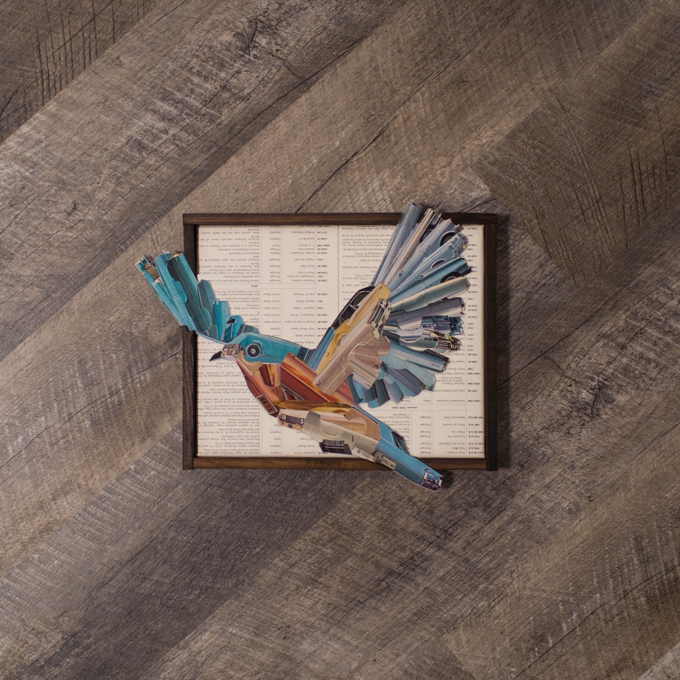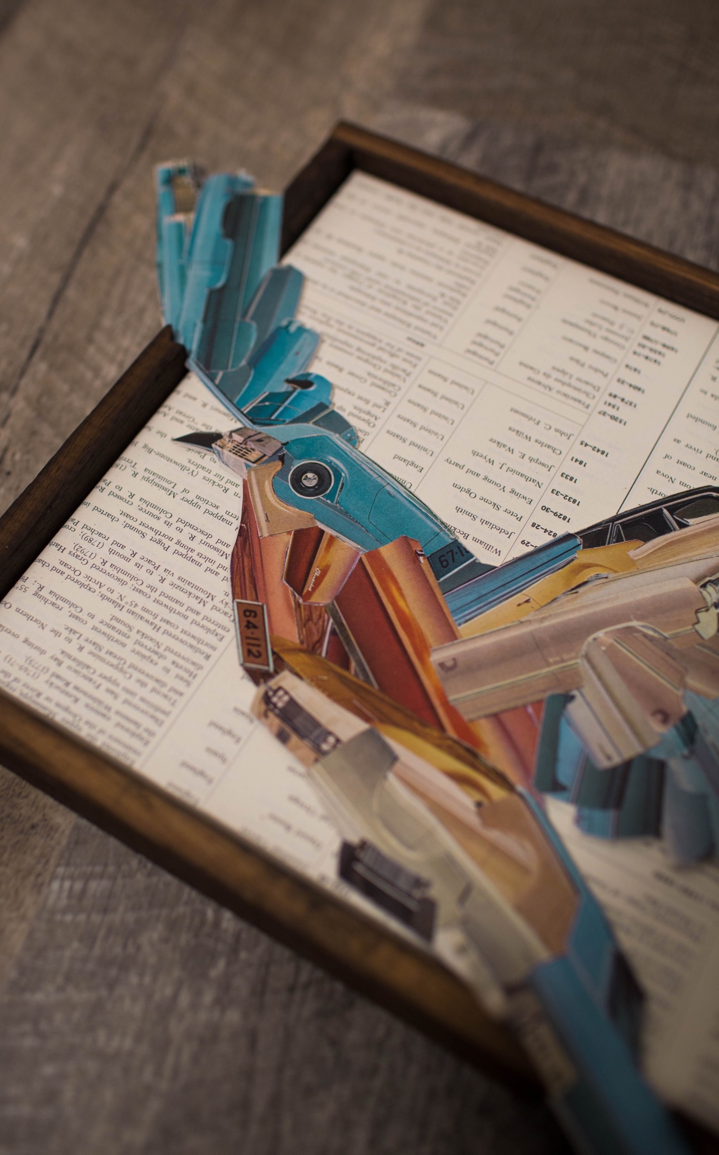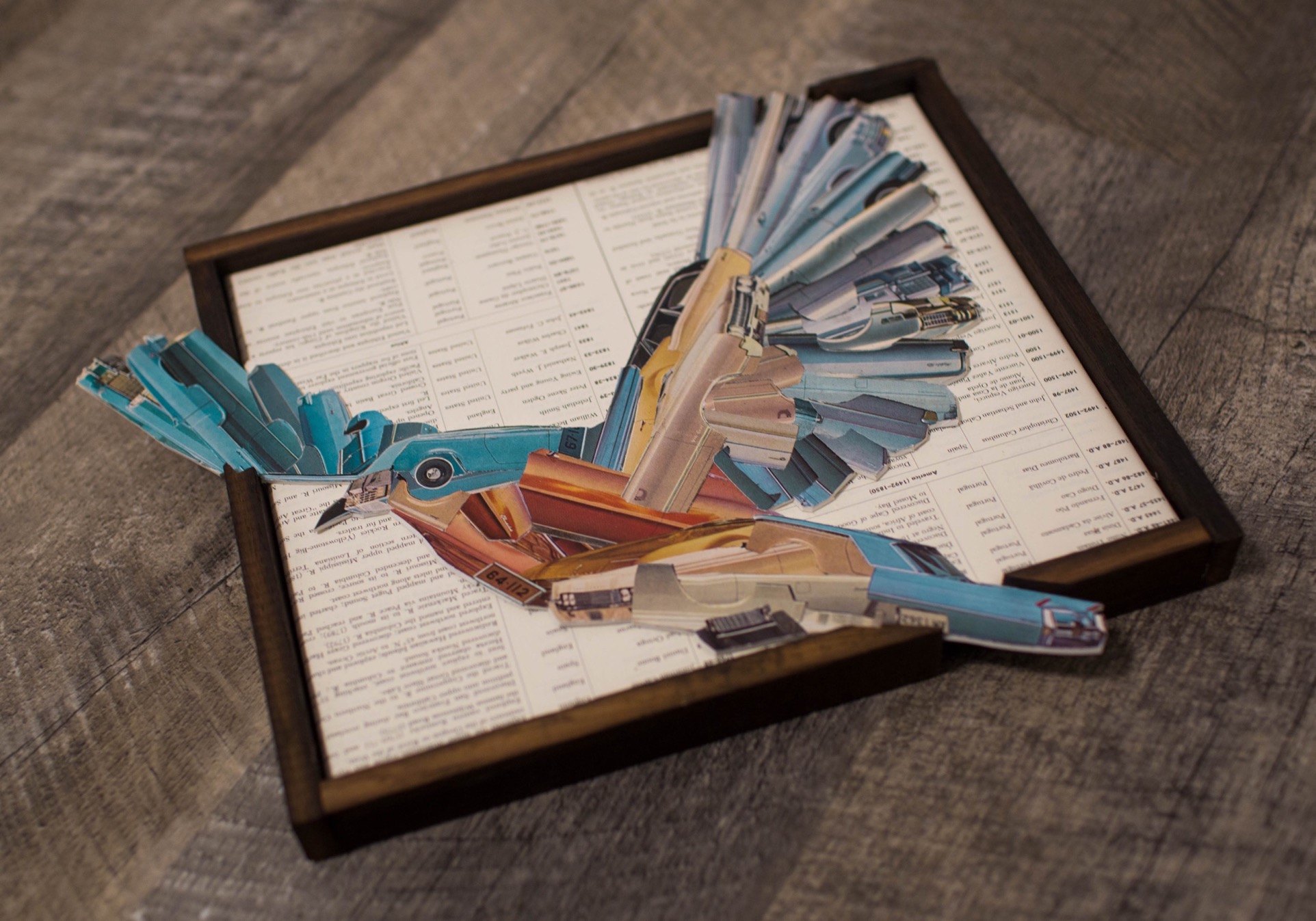 This piece is an idea I've wanted to try from the beginning... making a larger image out of cut out pieces. In this case, it's a bird out of cars.