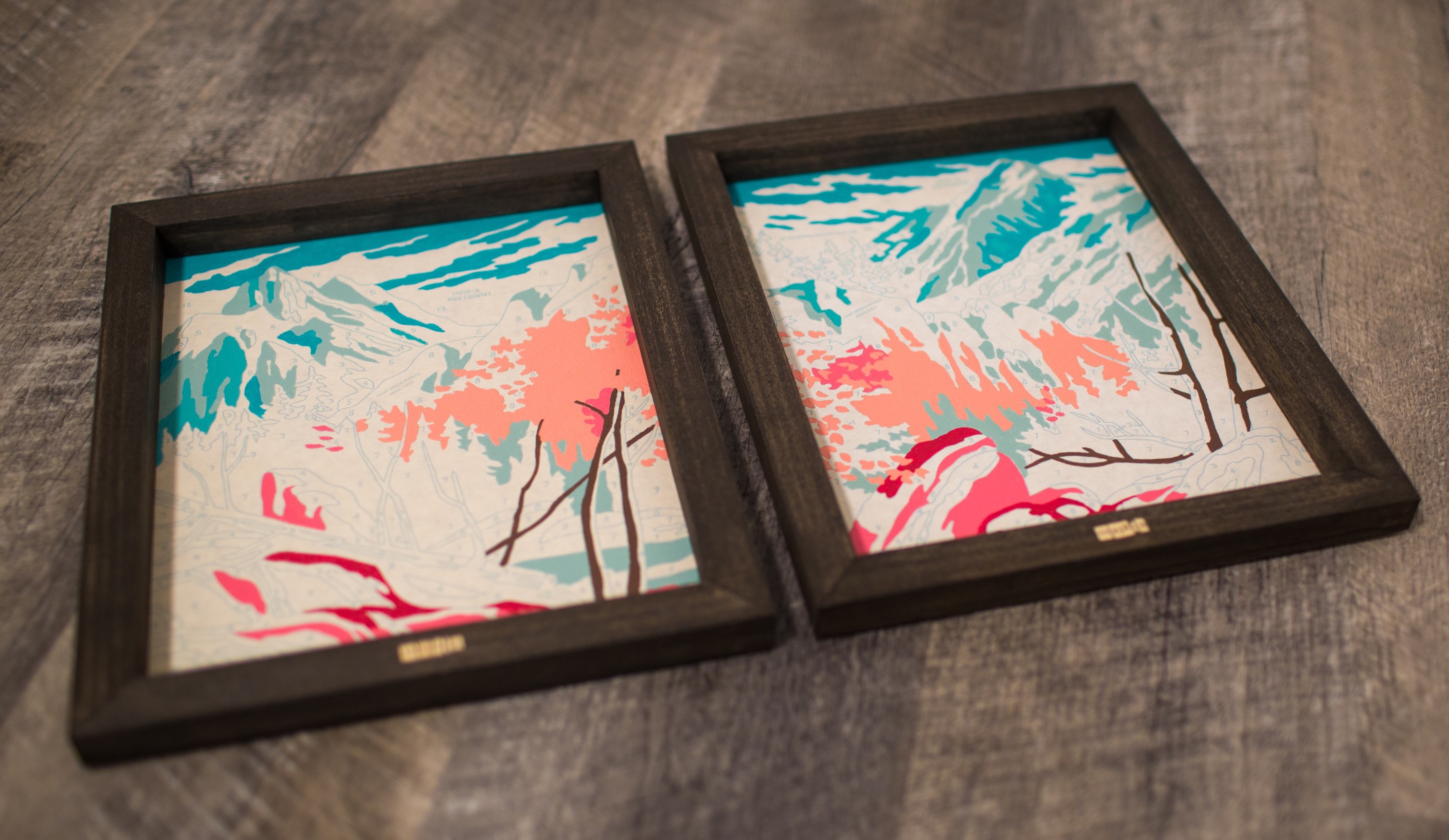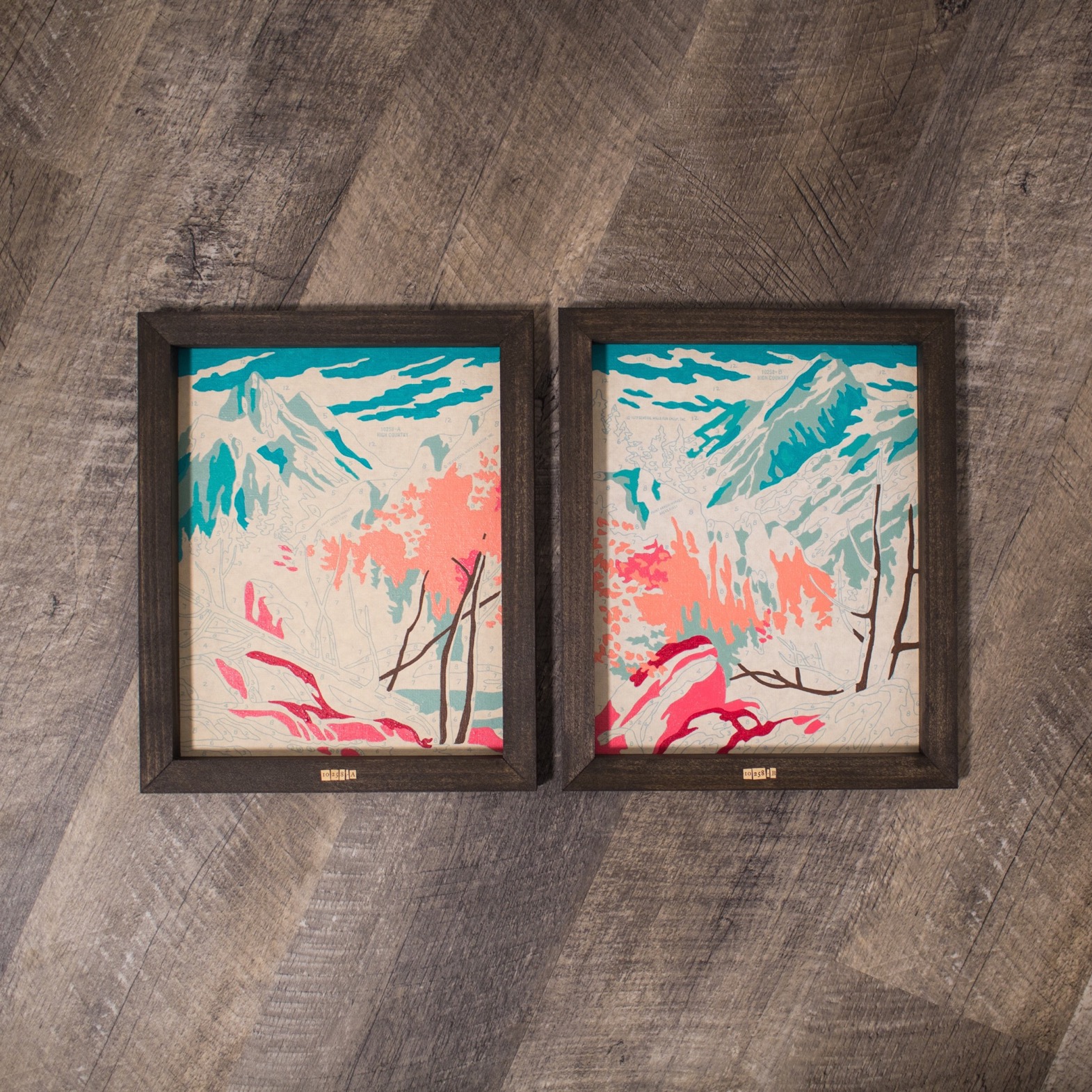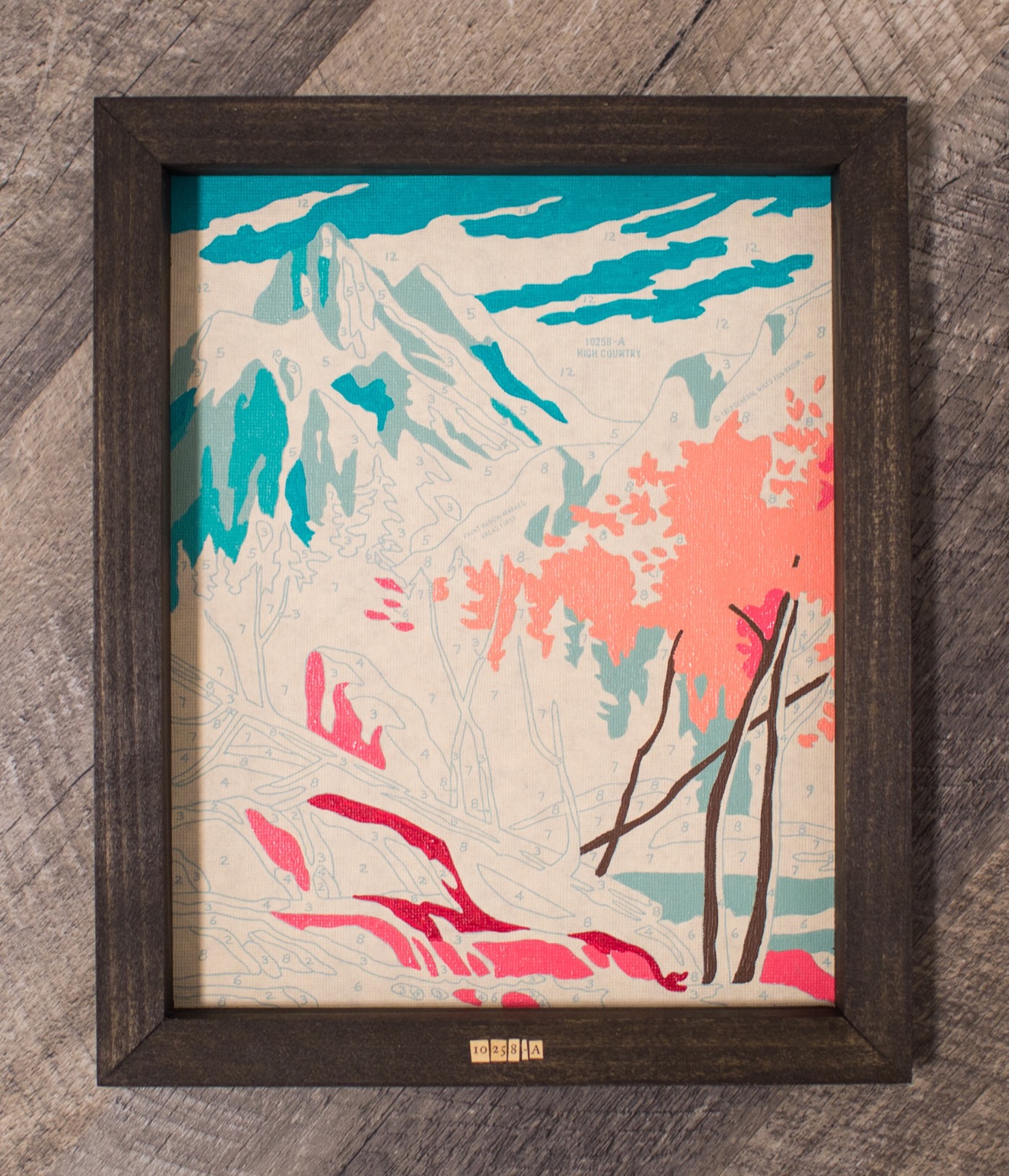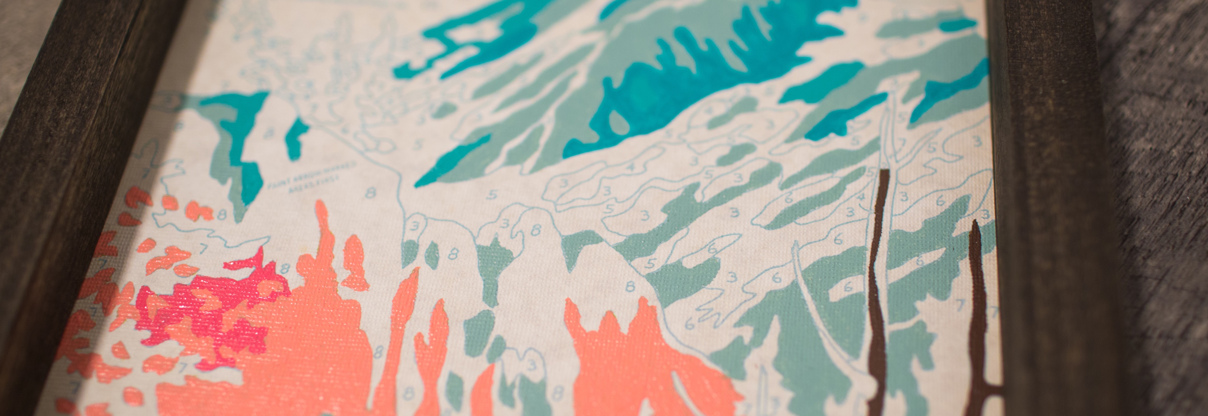 These pieces are paint-by-number canvases from 1977. I chose my own colors to map to the painting - using blues that were fairly close to what I imagine they'd have been, but then using reds in the place of colors that would have been greens and yellows. I also left the paintings unfinished, choosing to only fill in some of the canvas, thus keeping visible the underlying map of contour lines and number labels (which, to me, is usually more interesting than the finished painting.)