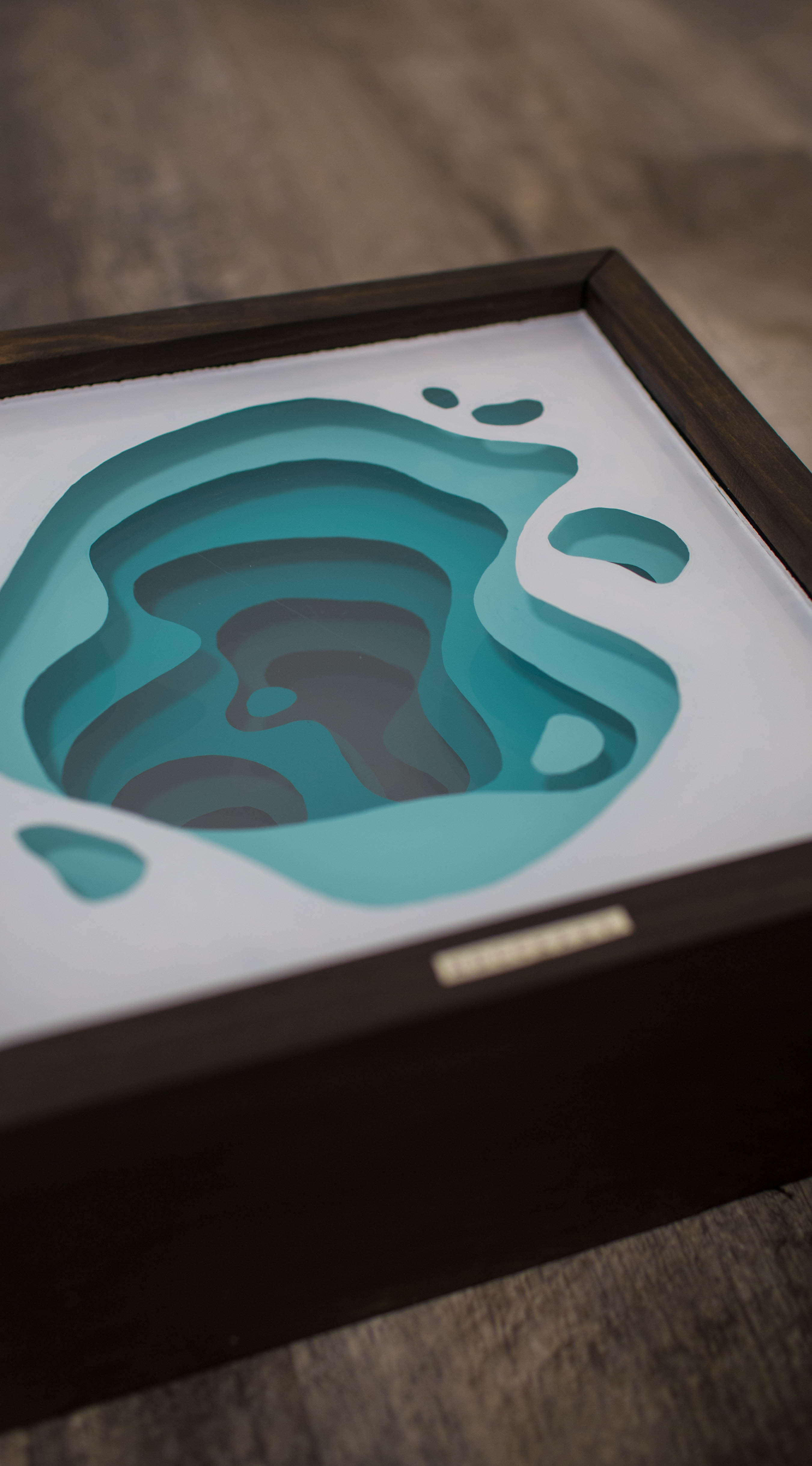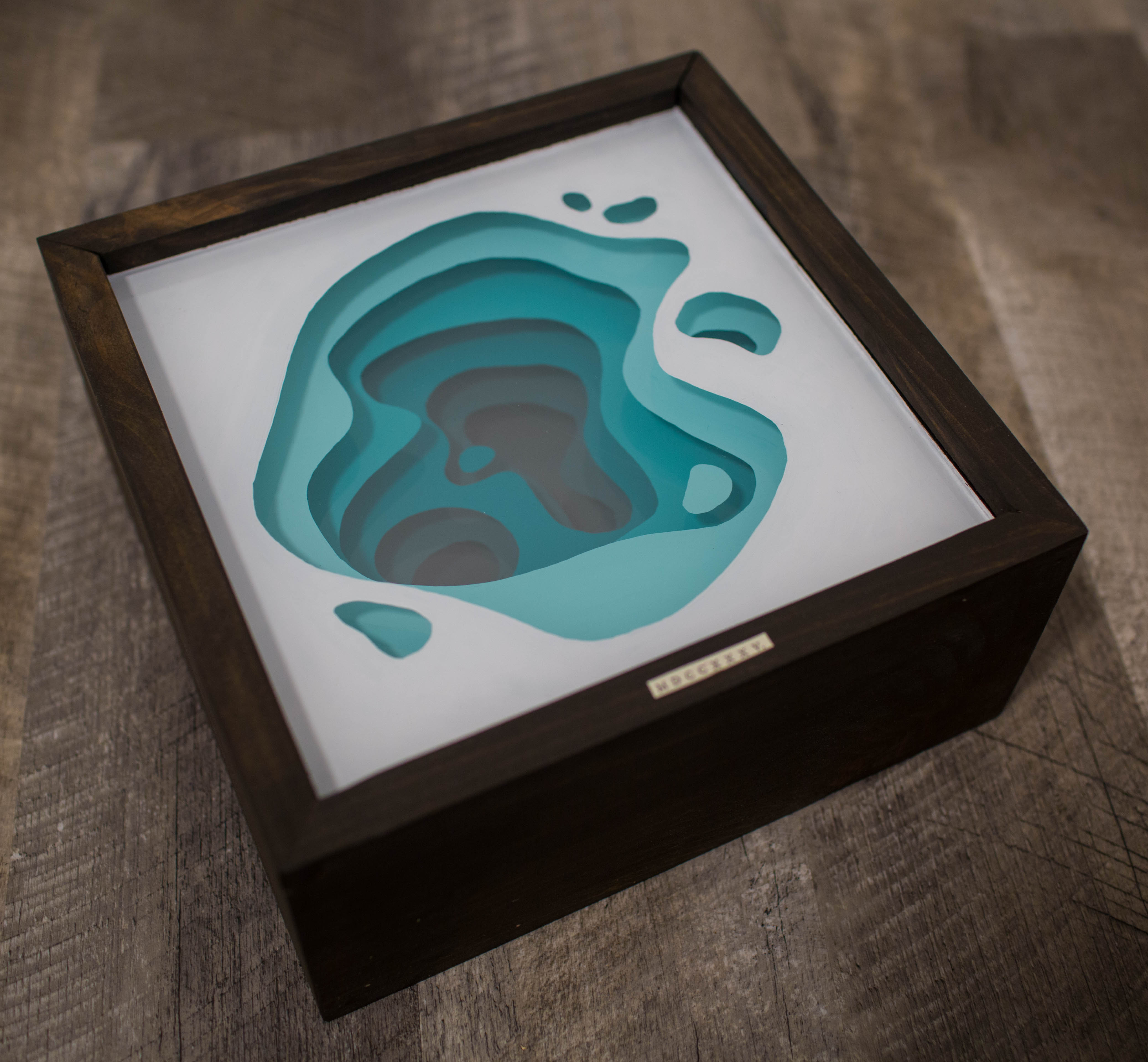 This piece continues with the idea of the ringlike topology, this time applied to the depth of a lake. I decided instead of layered paper and paint I would make physical layers out of acrylic. I had to build a custom frame that would hold each sheet a half inch apart.