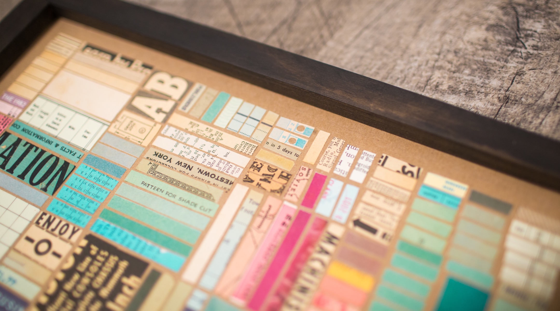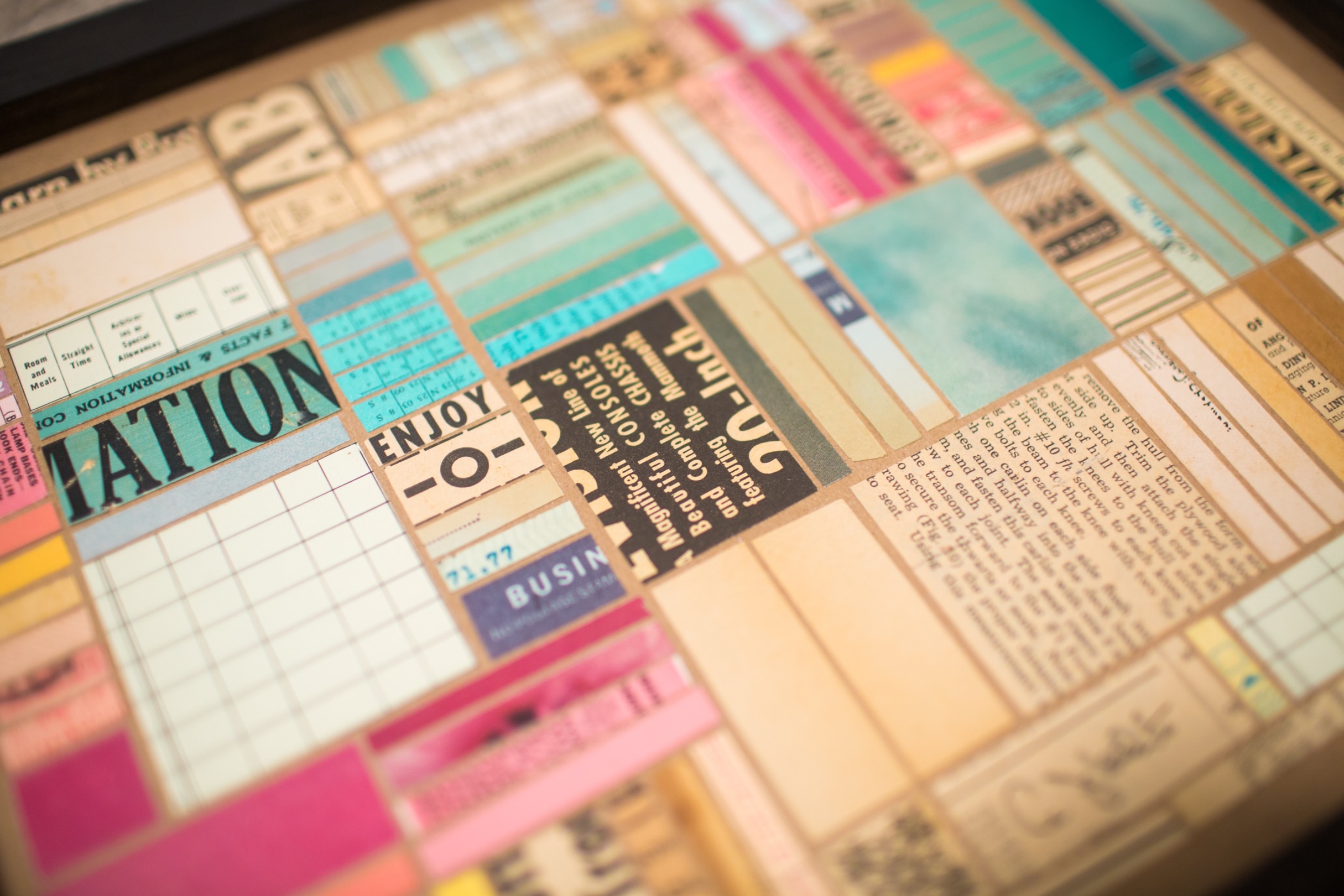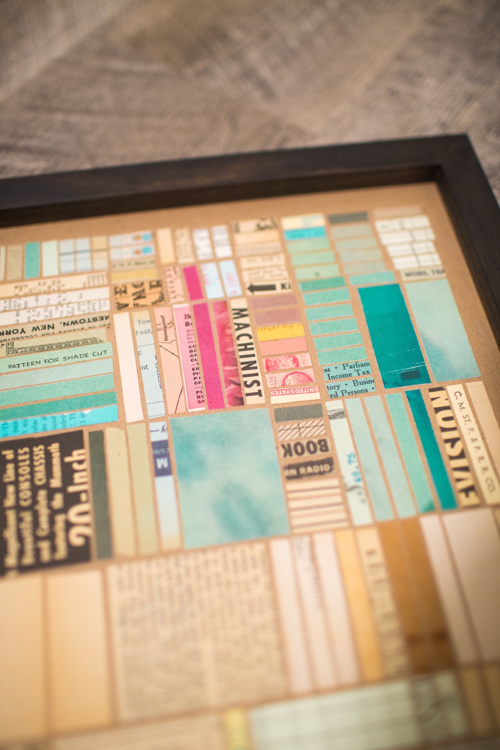 Hundreds of cut pieces work together here to create a grid composition here similar to a city layout seen from above. Color blocks and typographic texture play a huge role in the visual interest of the piece.