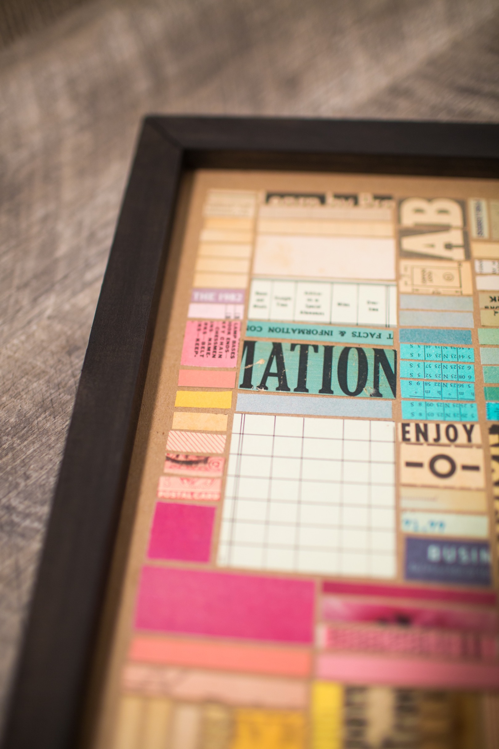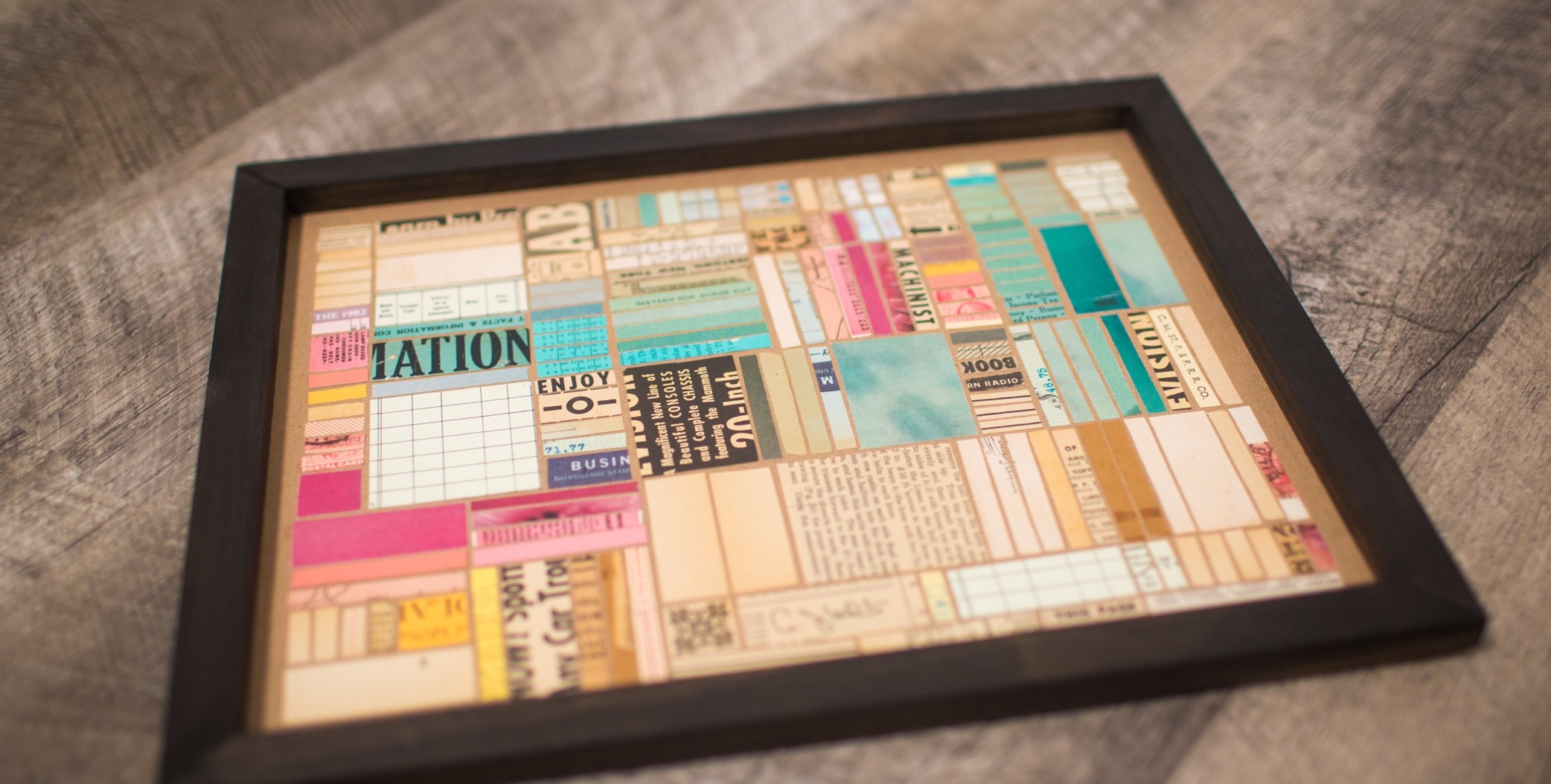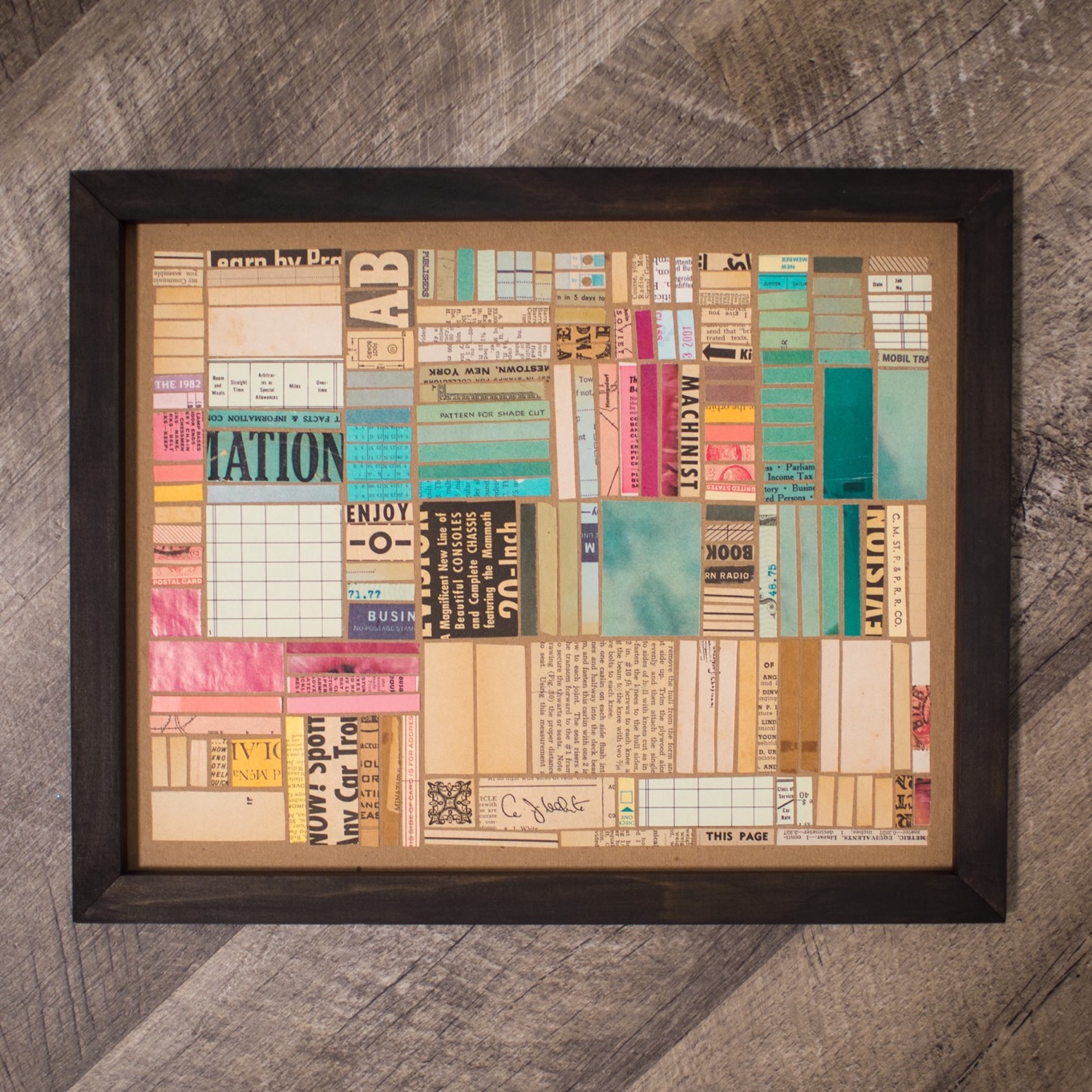 Hundreds of cut pieces work together here to create a grid composition here similar to a city layout seen from above. Color blocks and typographic texture play a huge role in the visual interest of the piece.