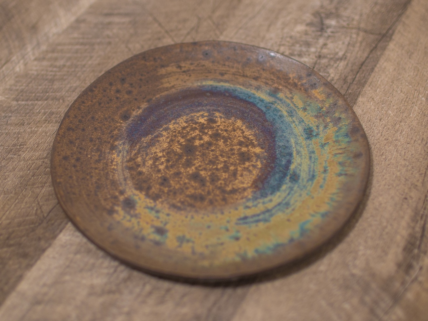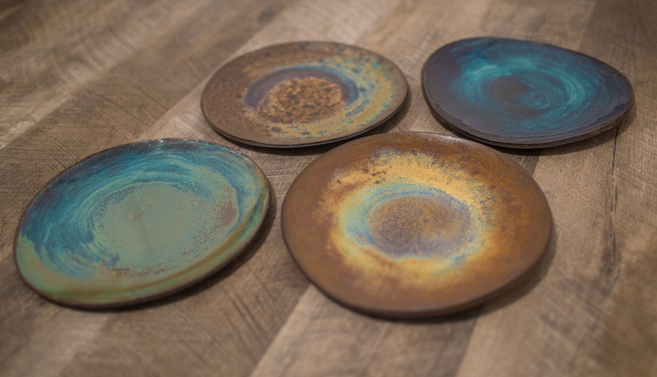 These plates use a total of four glazes. Each plate only contains three of them, and each one has a different configuration and percentage of each glaze. The result is a set that is simultaneously unified, yet each piece is unique.