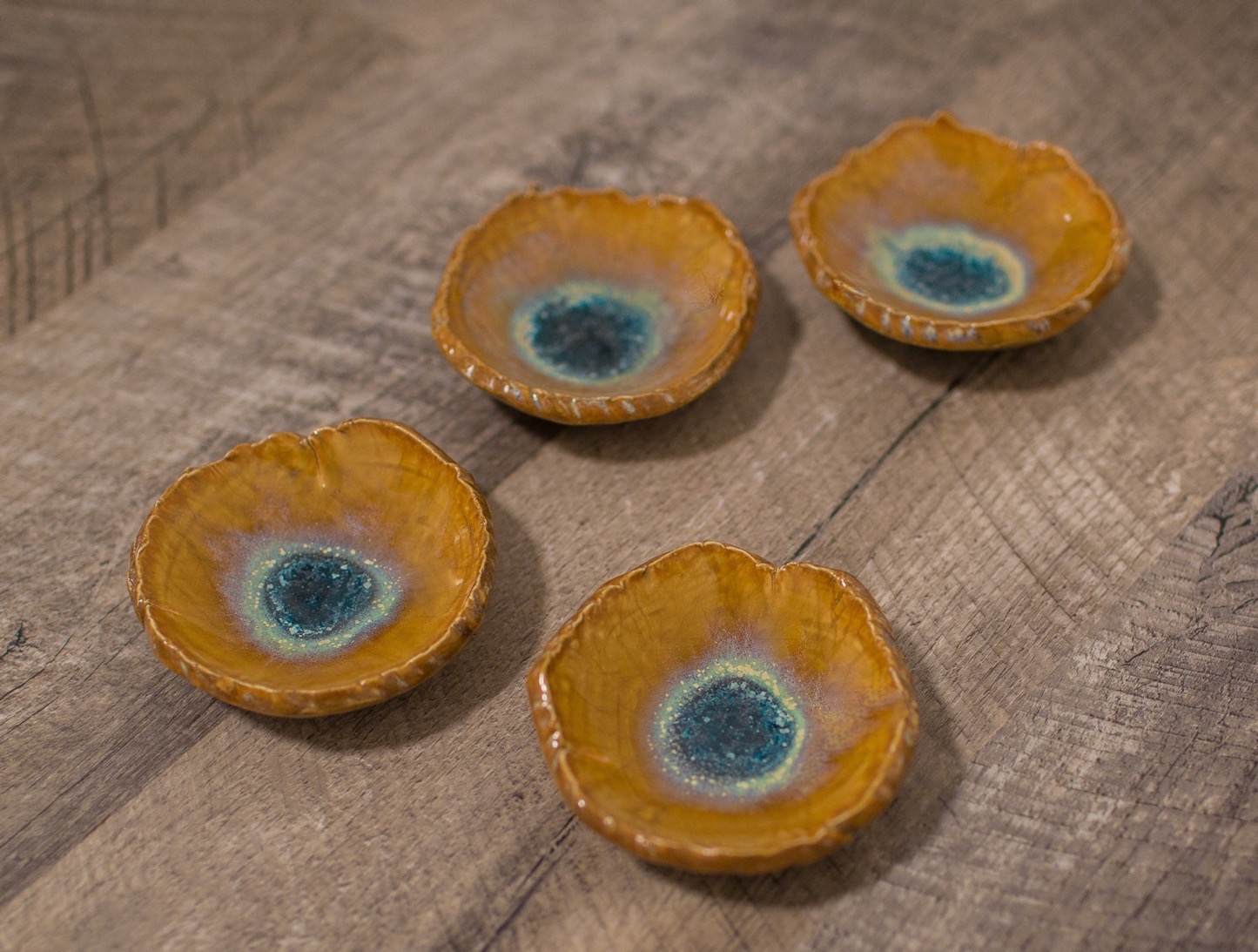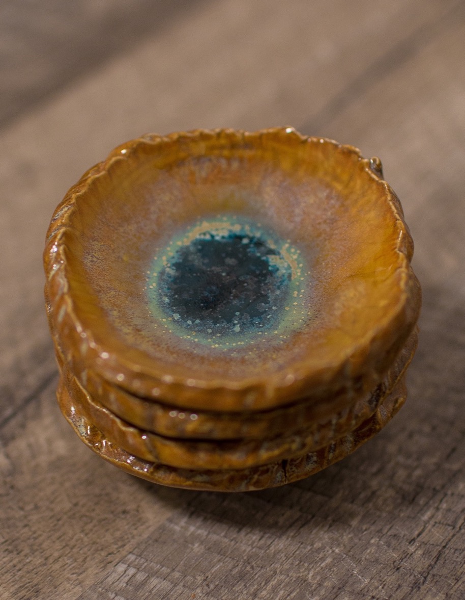 These bowls are my first foray into glaze mixing. Several glazes are layered to create chemical interactions in the firing process. I'm really pleased with these.