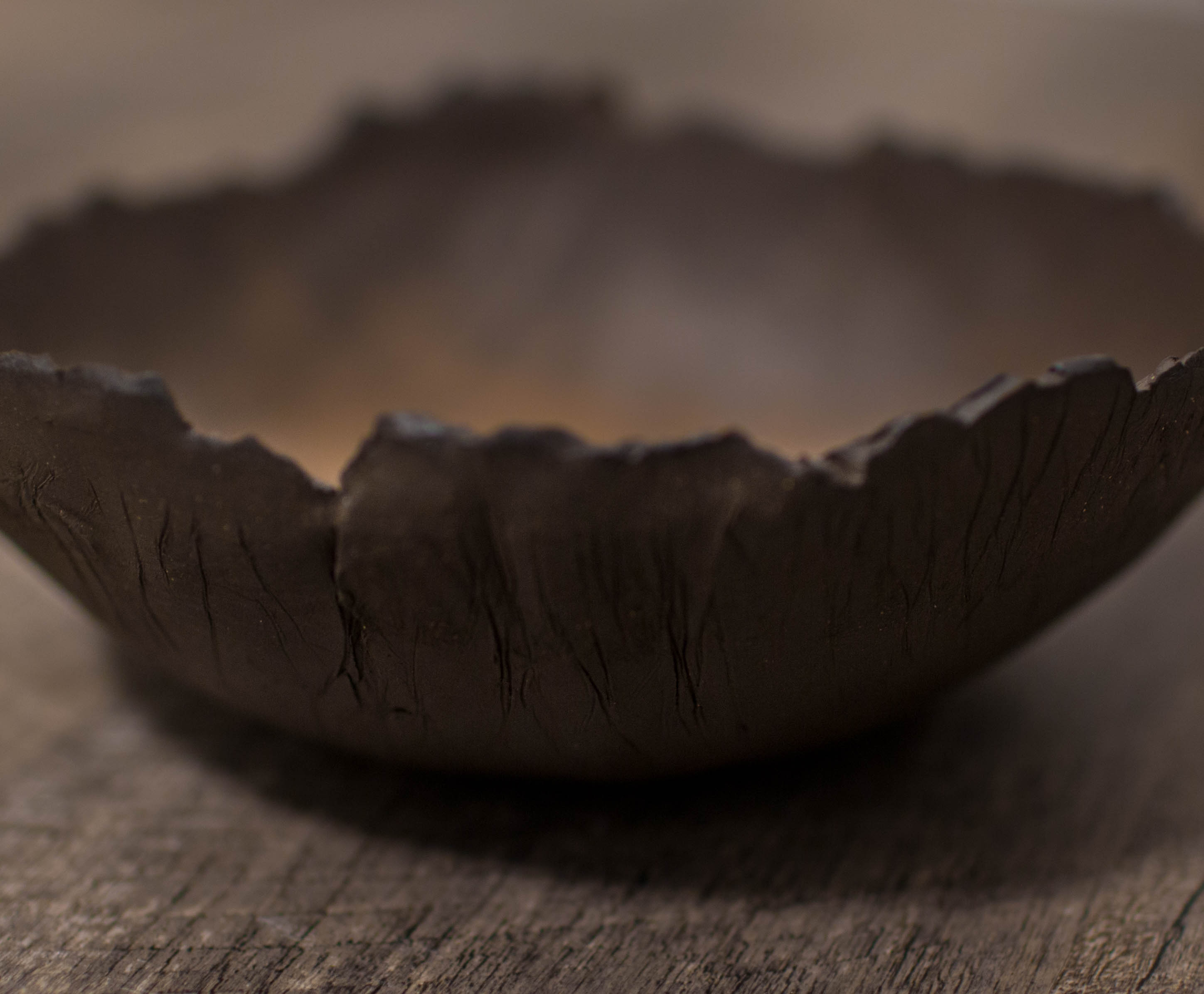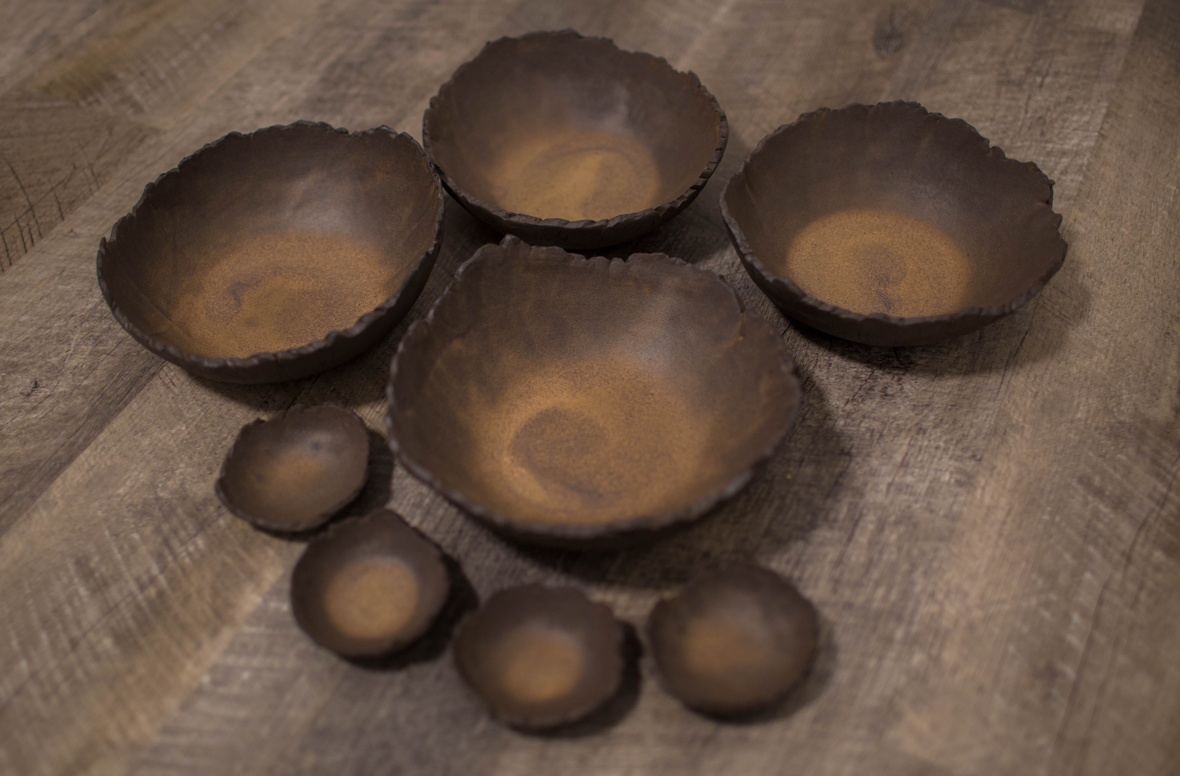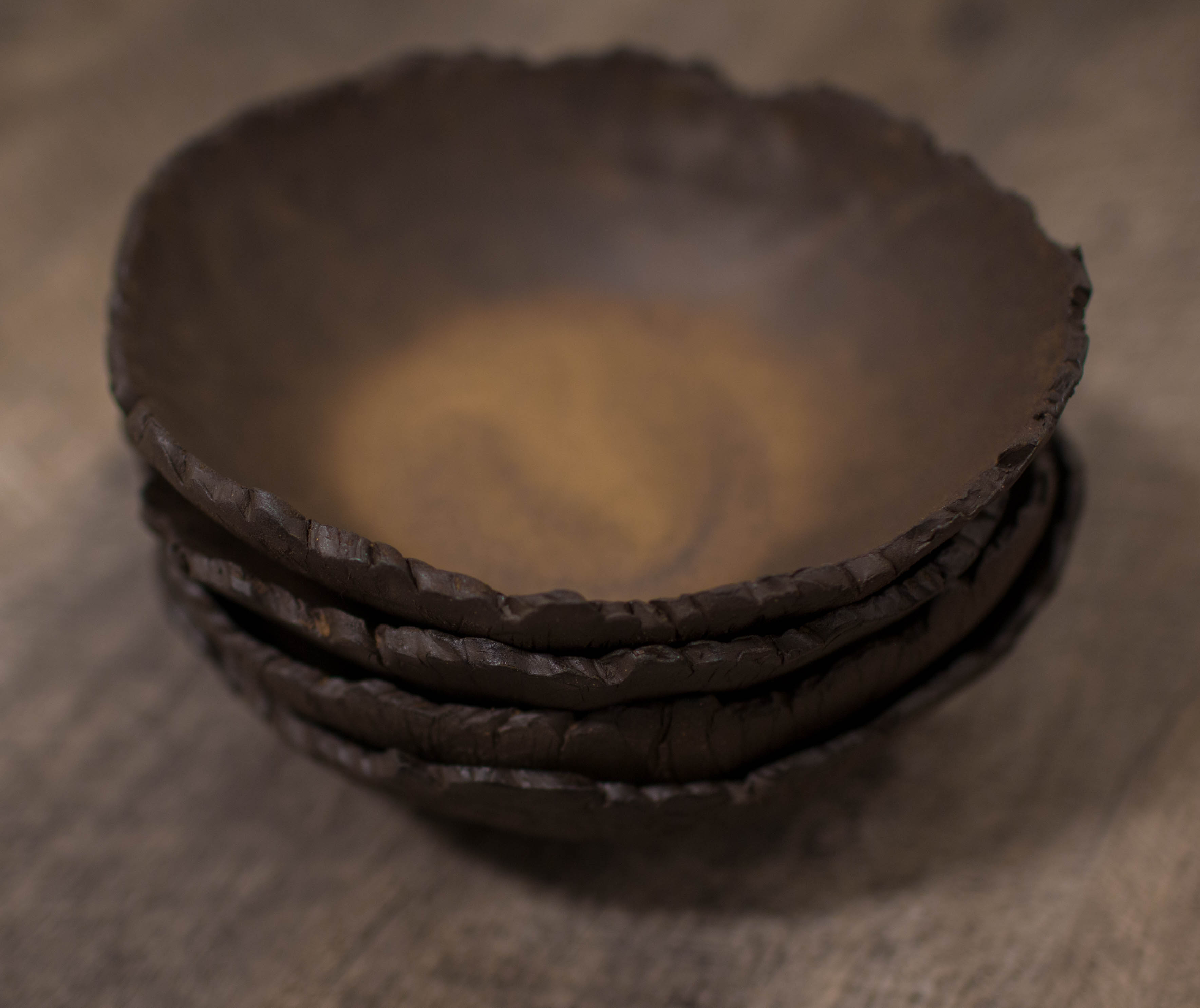 These bowls were molded rather than thrown. Using a variety of materials to achieve a rough, organic texture on the outside (almost like tree bark) and a very dark clay, I achieved a set of bowls that feel very natural and organic.