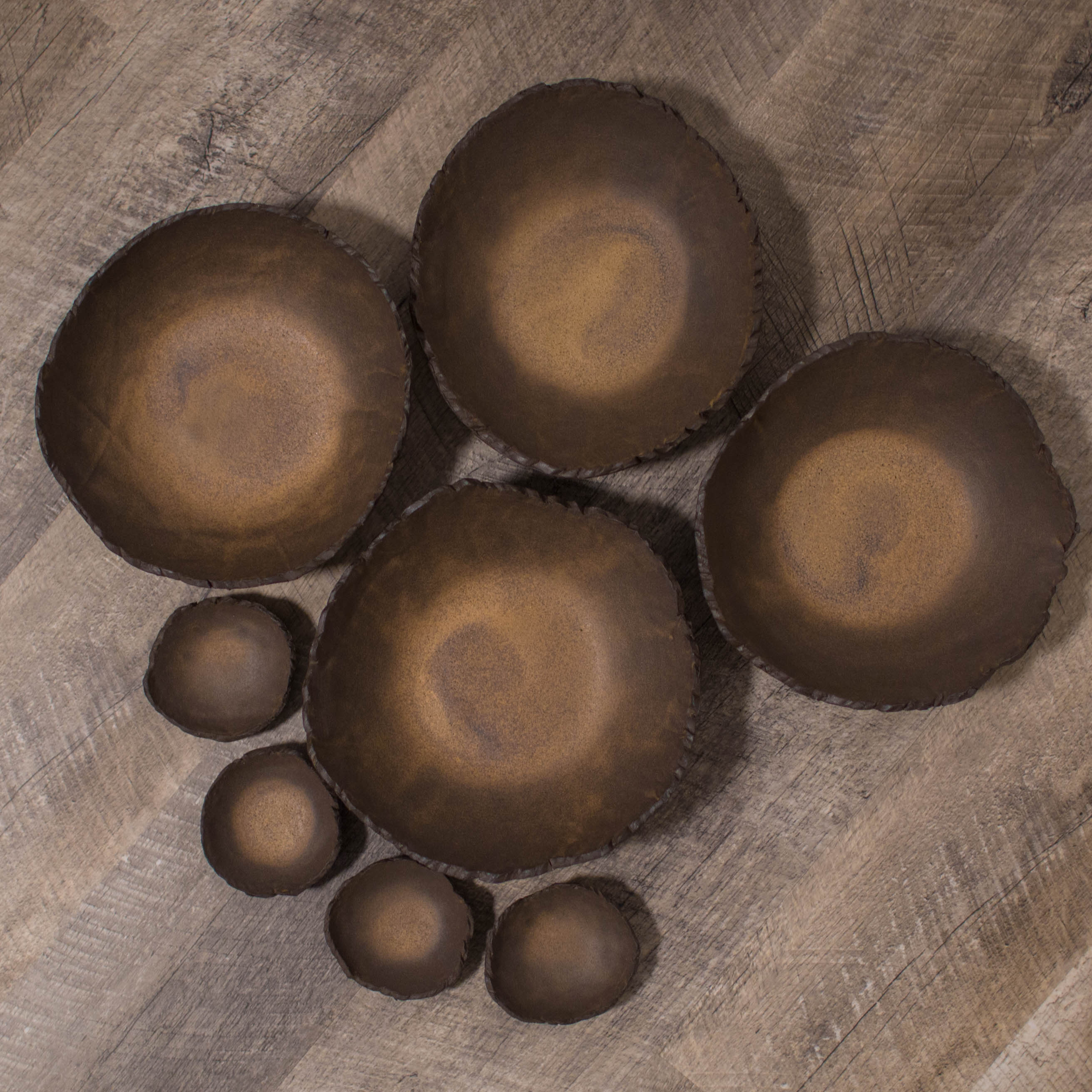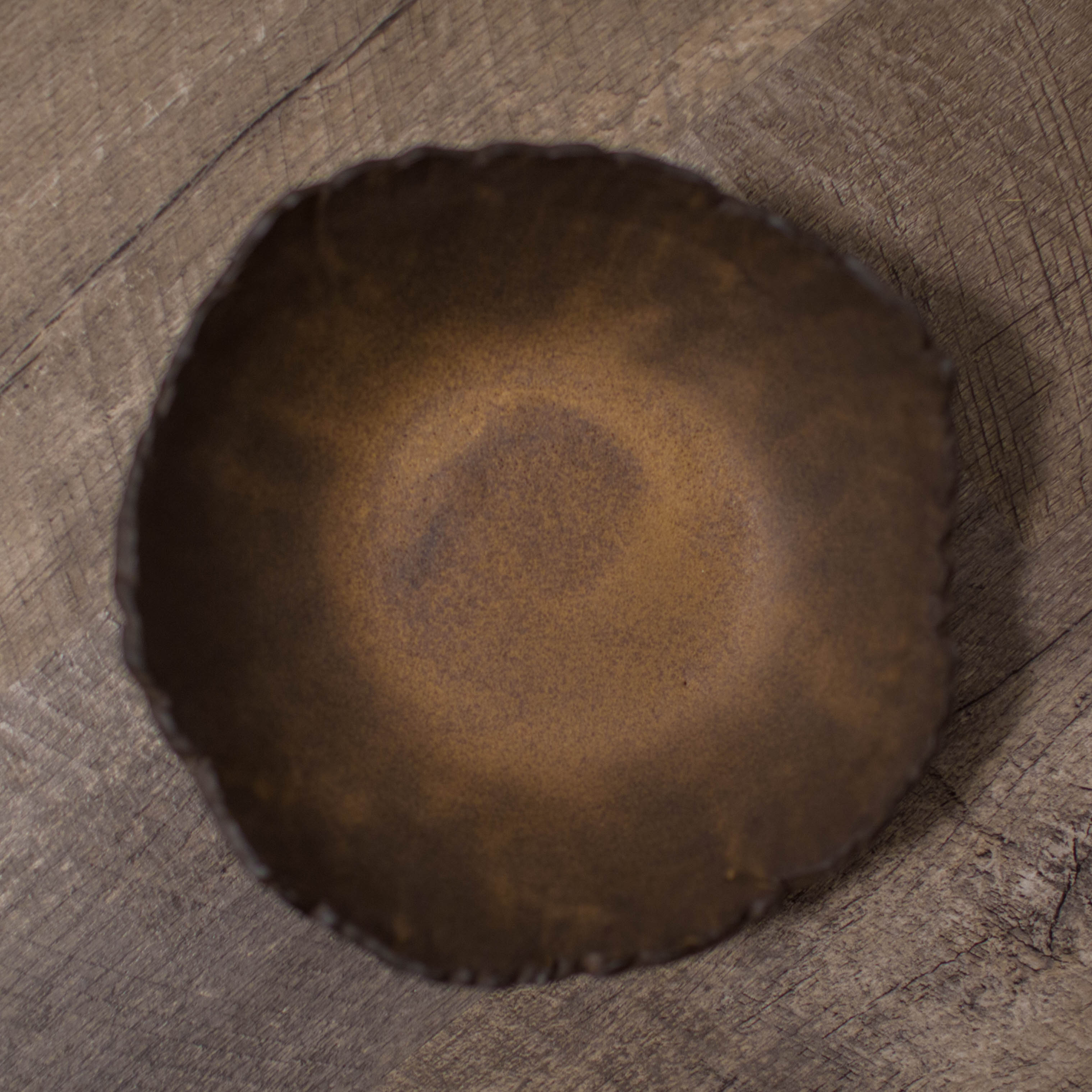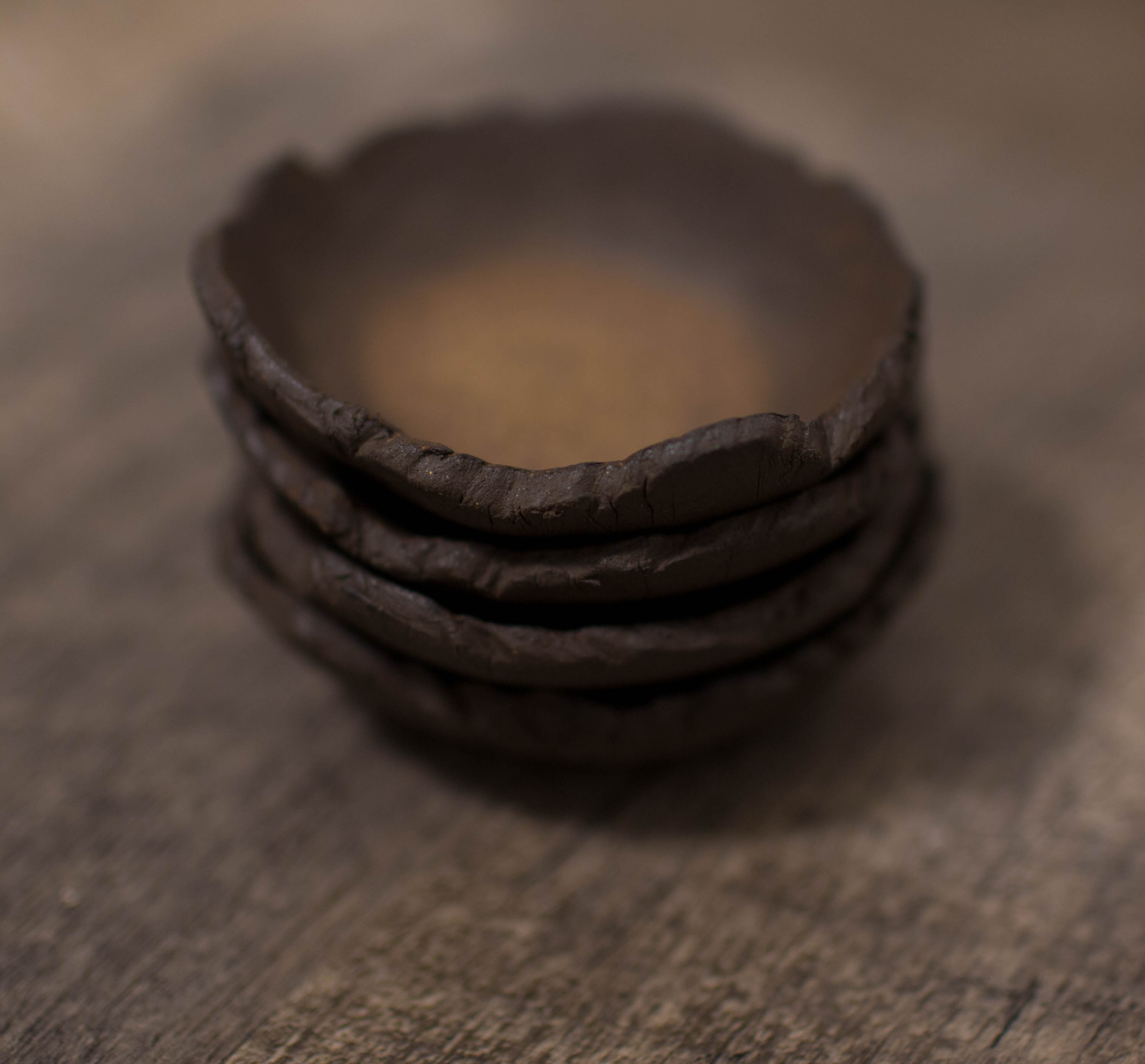 These bowls were molded rather than thrown. Using a variety of materials to achieve a rough, organic texture on the outside (almost like tree bark) and a very dark clay, I achieved a set of bowls that feel very natural and organic.
