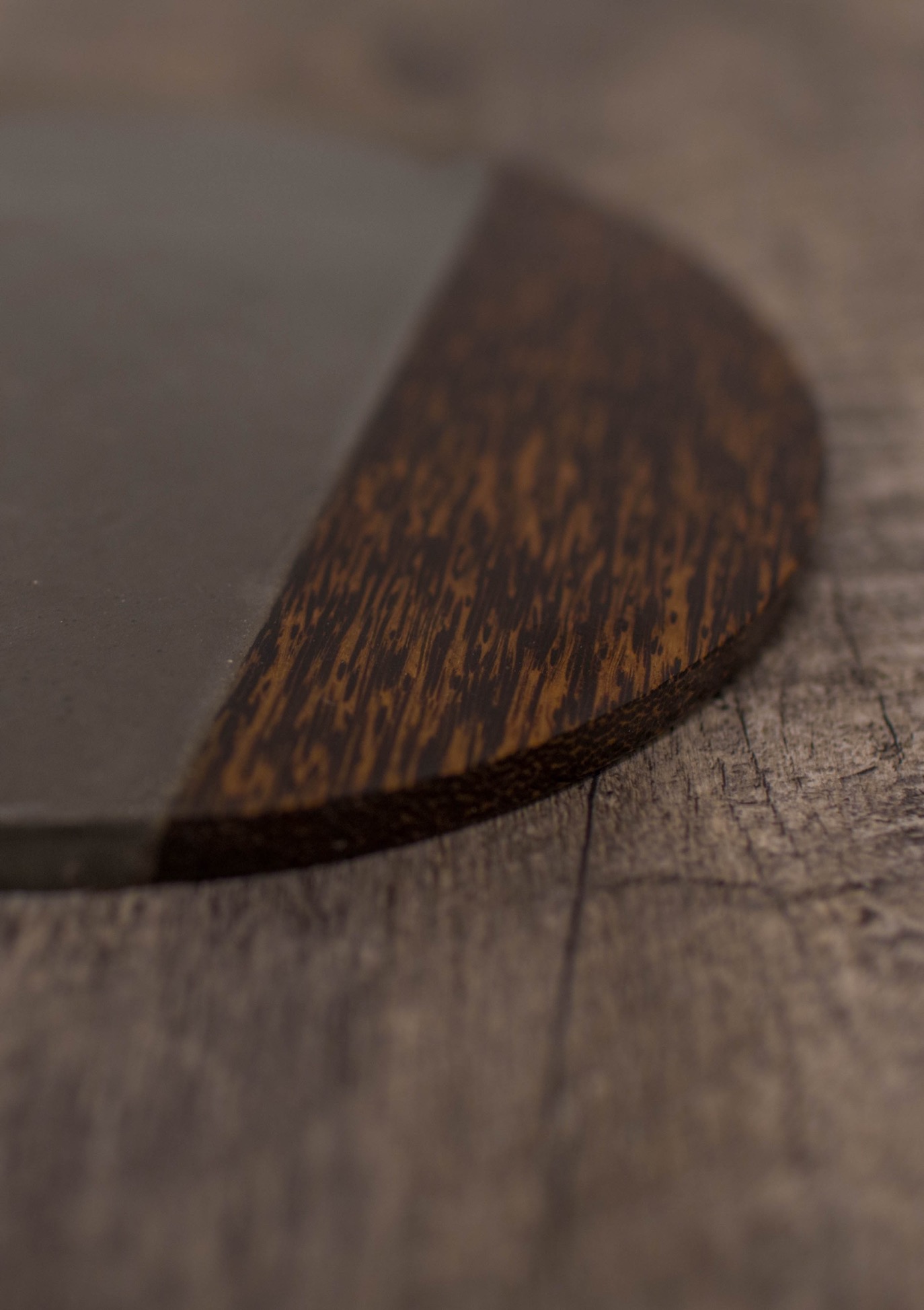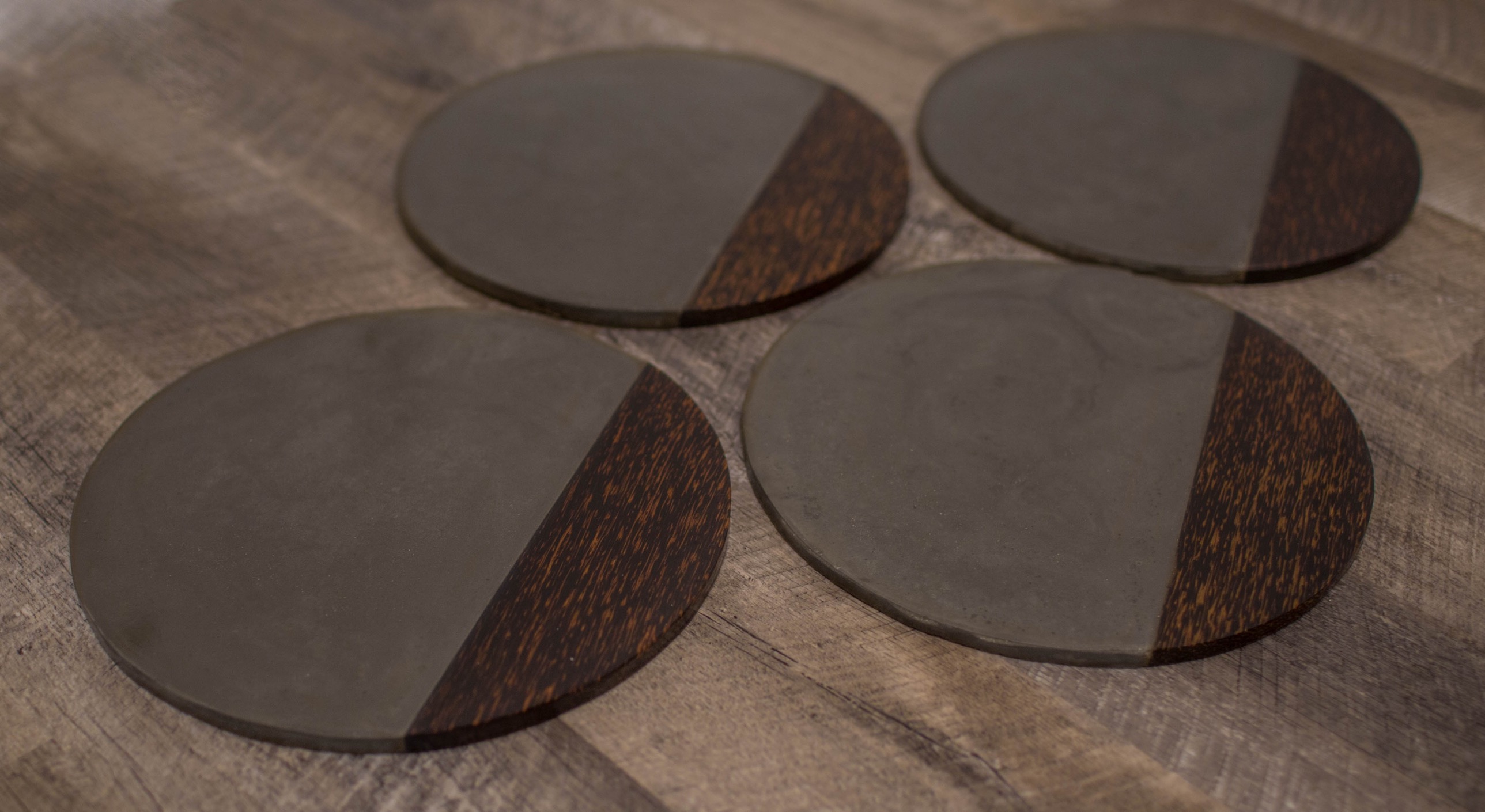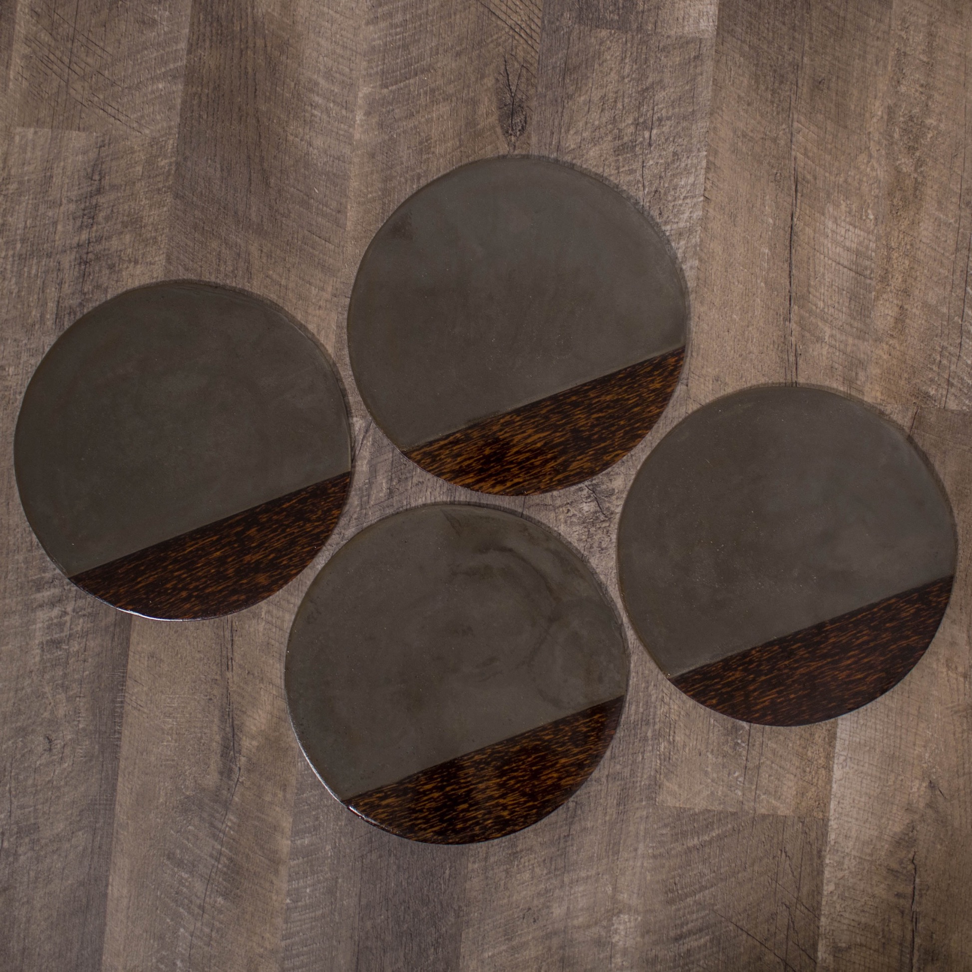 These plates are part concrete, part Black Palm. They are coated with food safe epoxy resin.