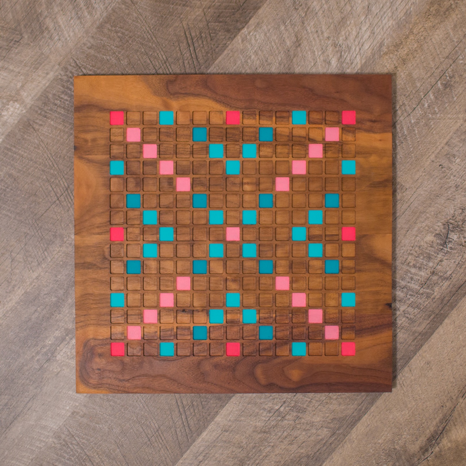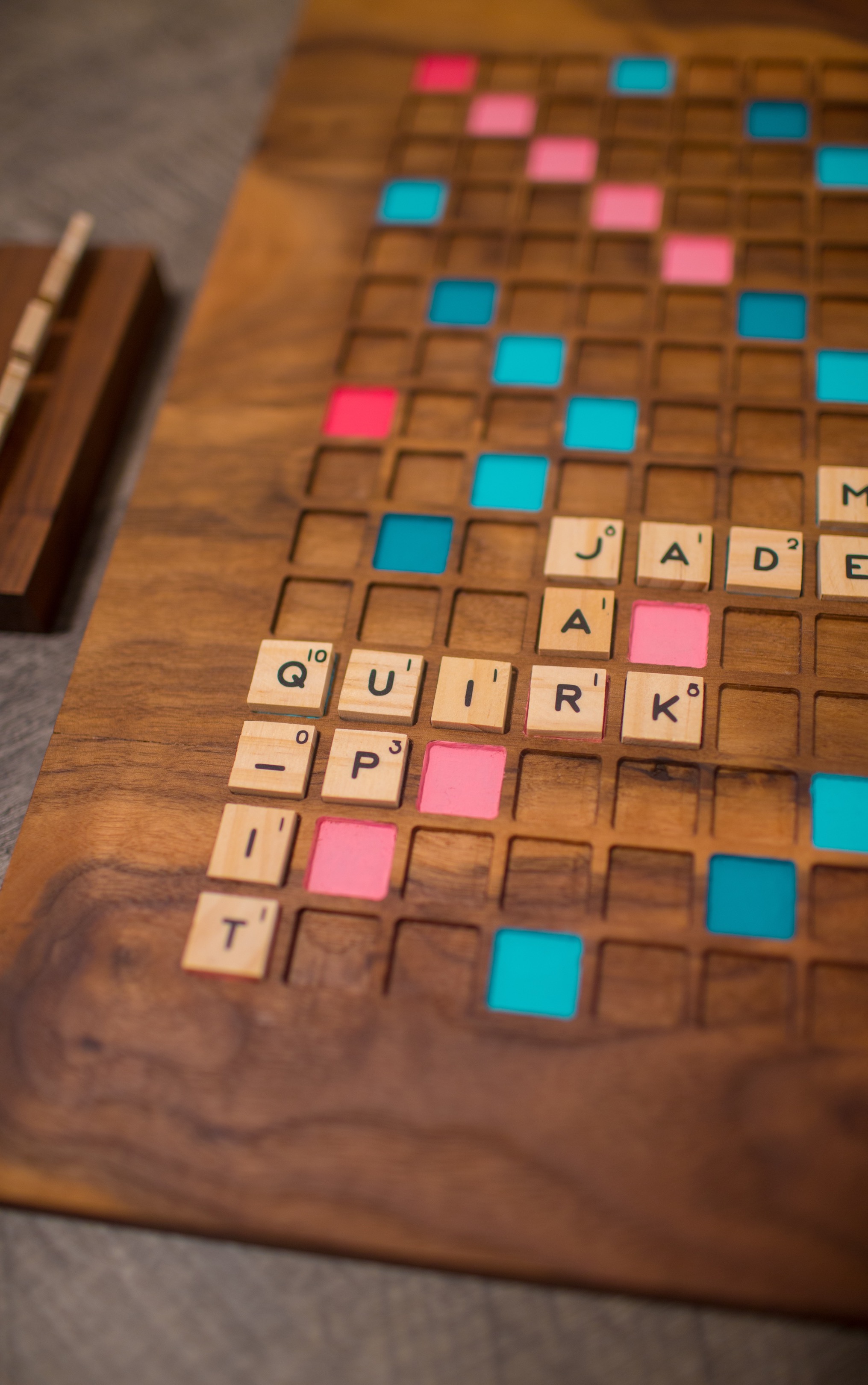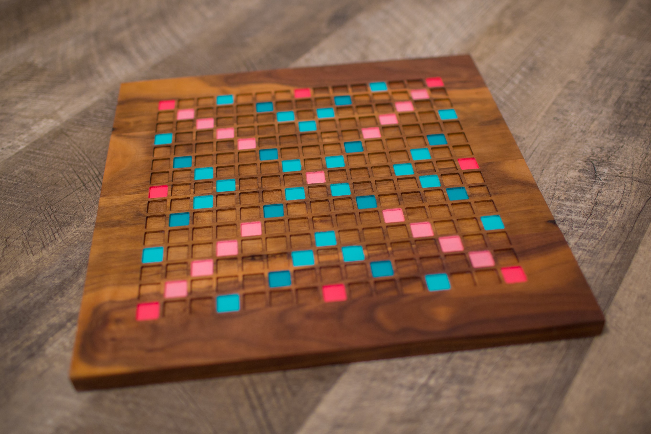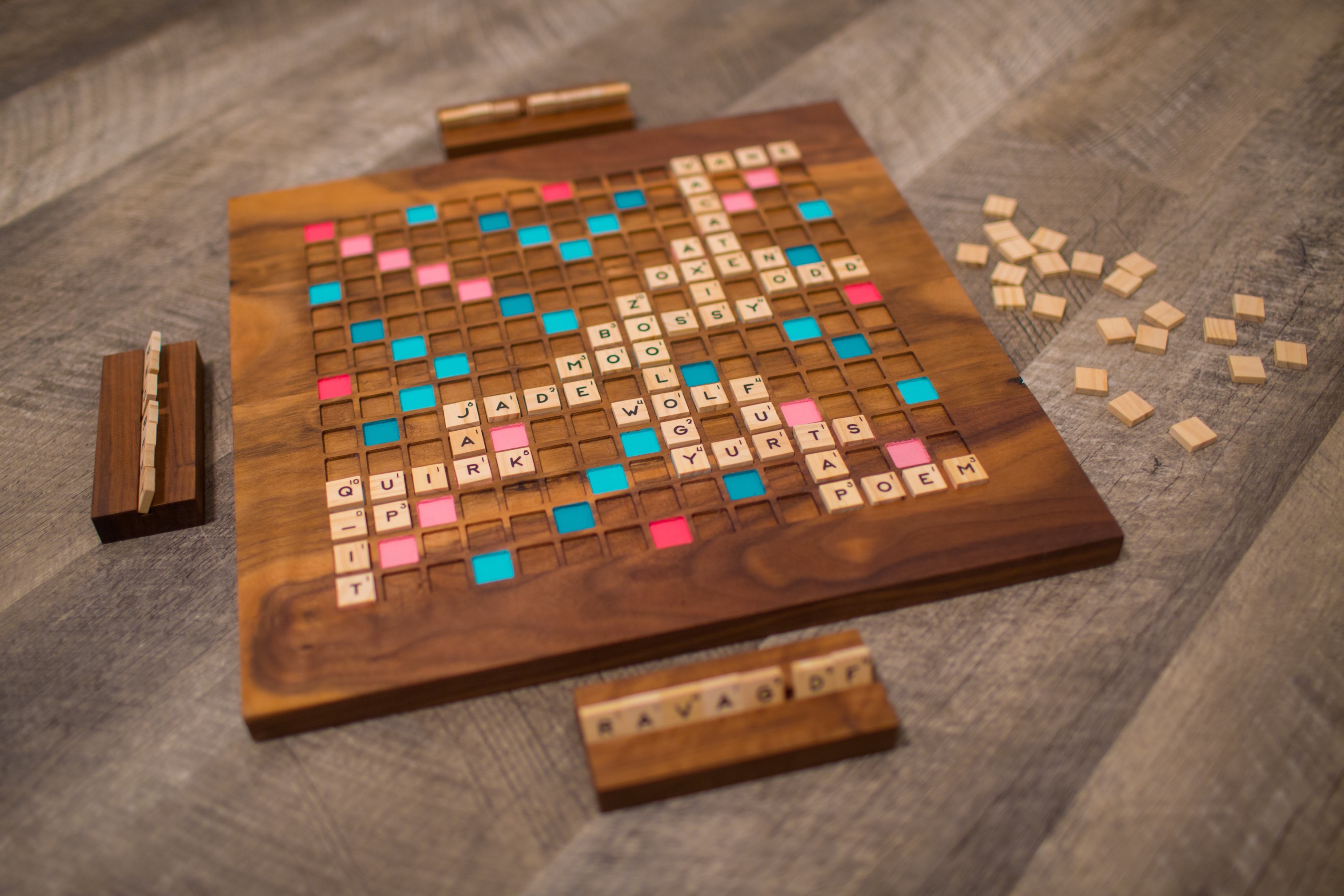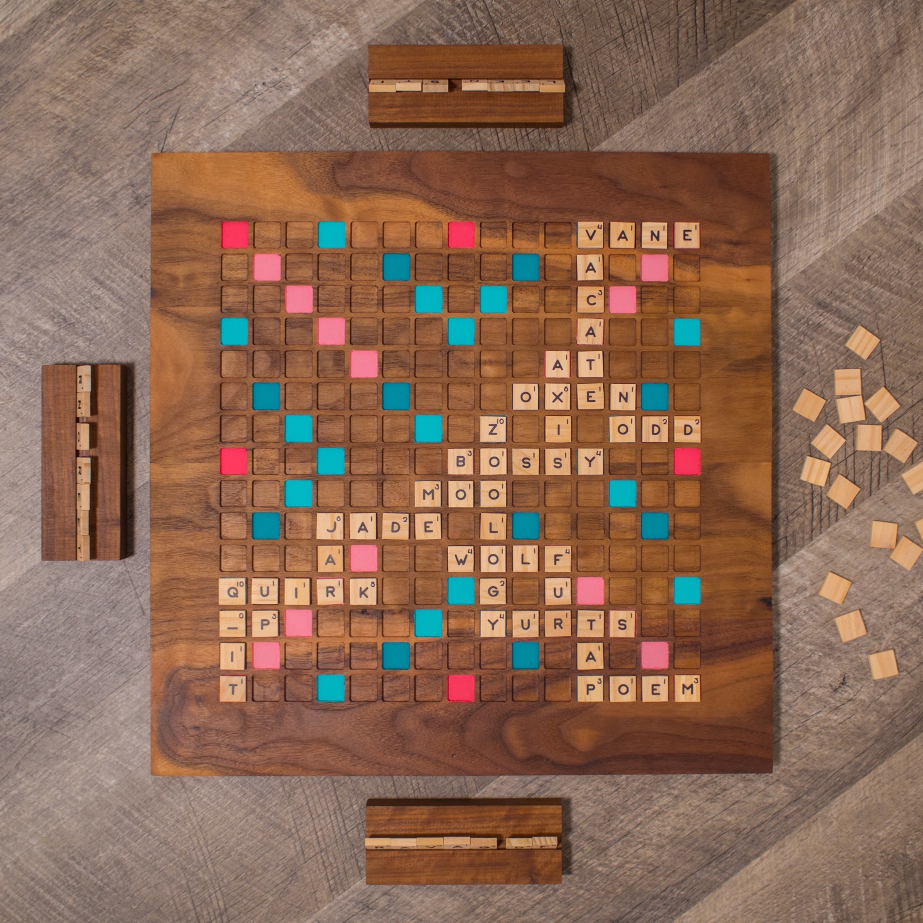This custom Scrabble set starts with Fig Walnut boards. Using the CNC router, I created wells for each tile to sit in. The Word Score and Letter Score spaces are painted. I designed a custom typeface and used a vinyl cutter to create all 100 letter tiles out of Curly Maple. Finally, I created a set of four stands for each player's tiles.