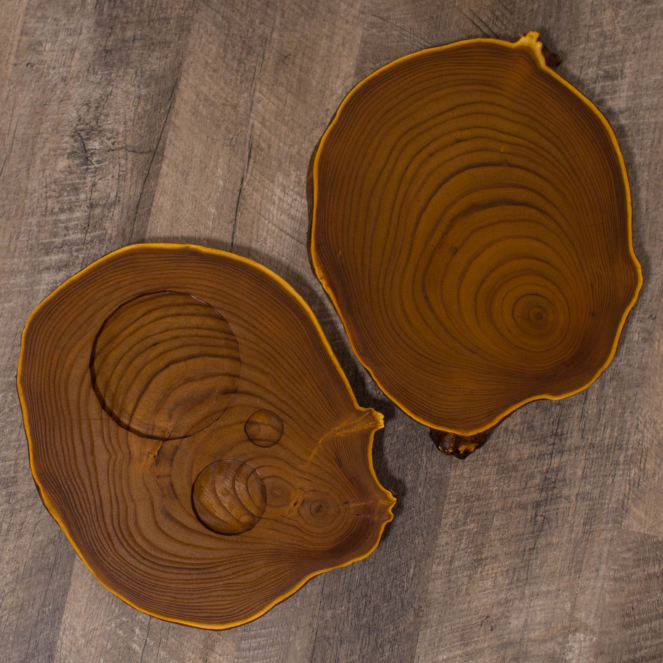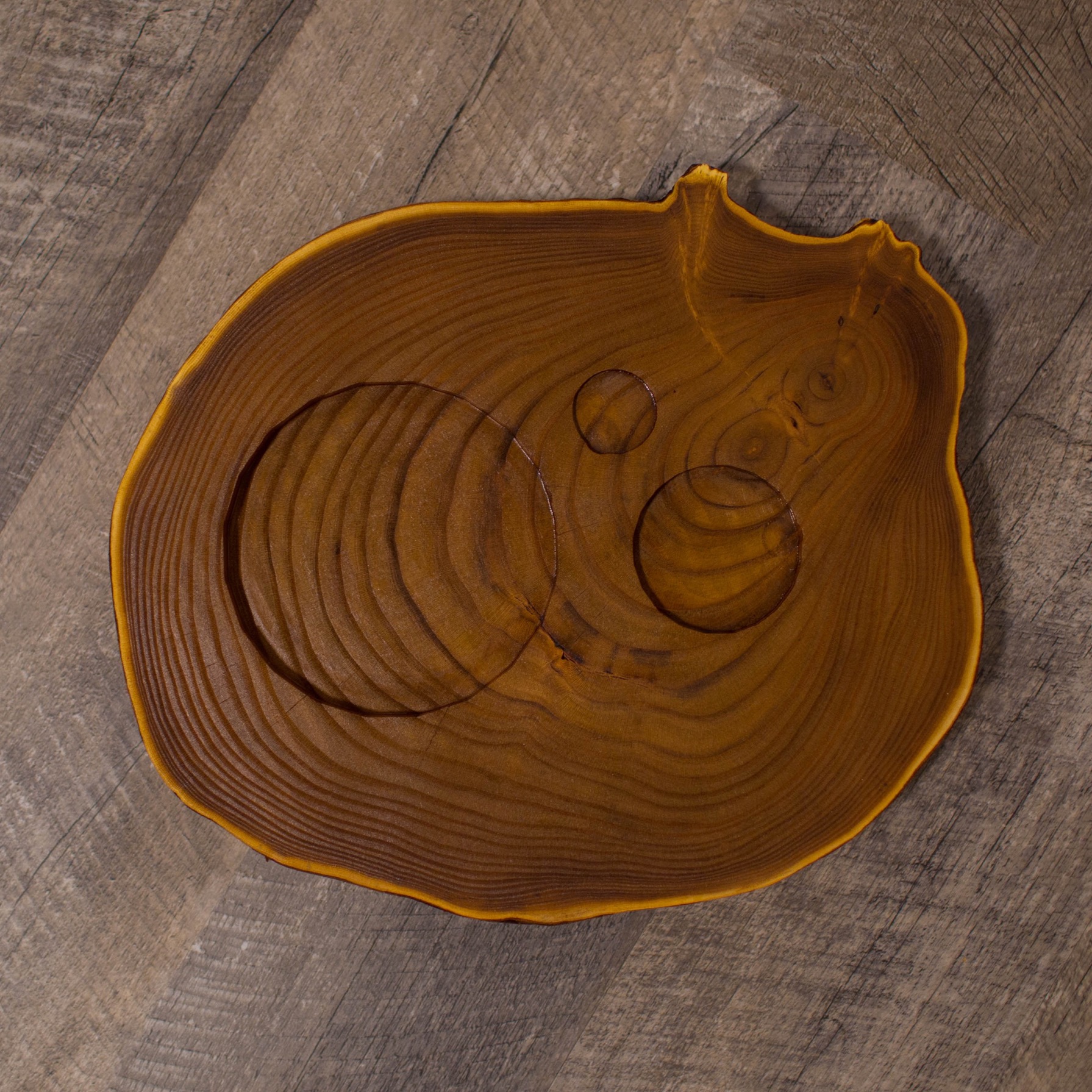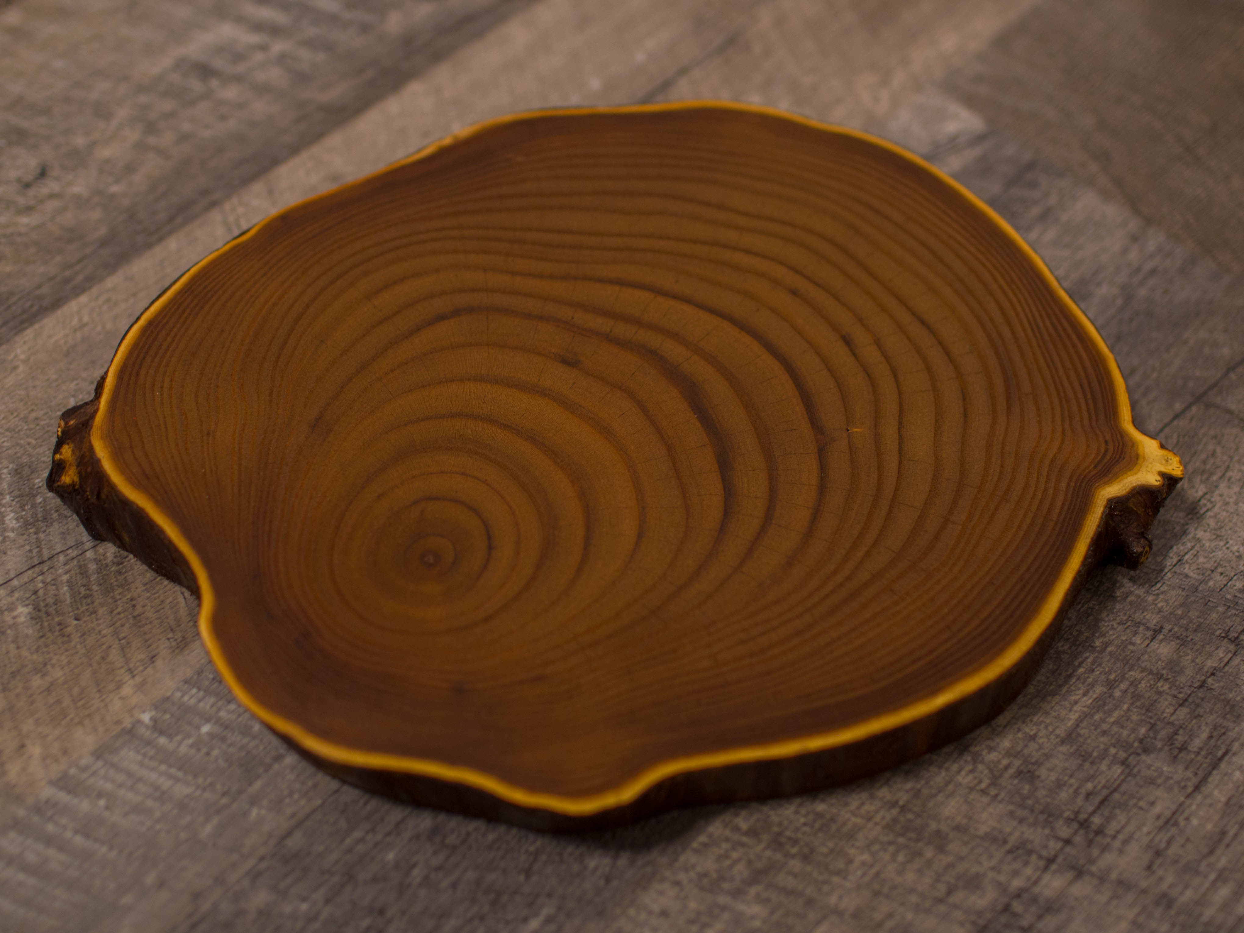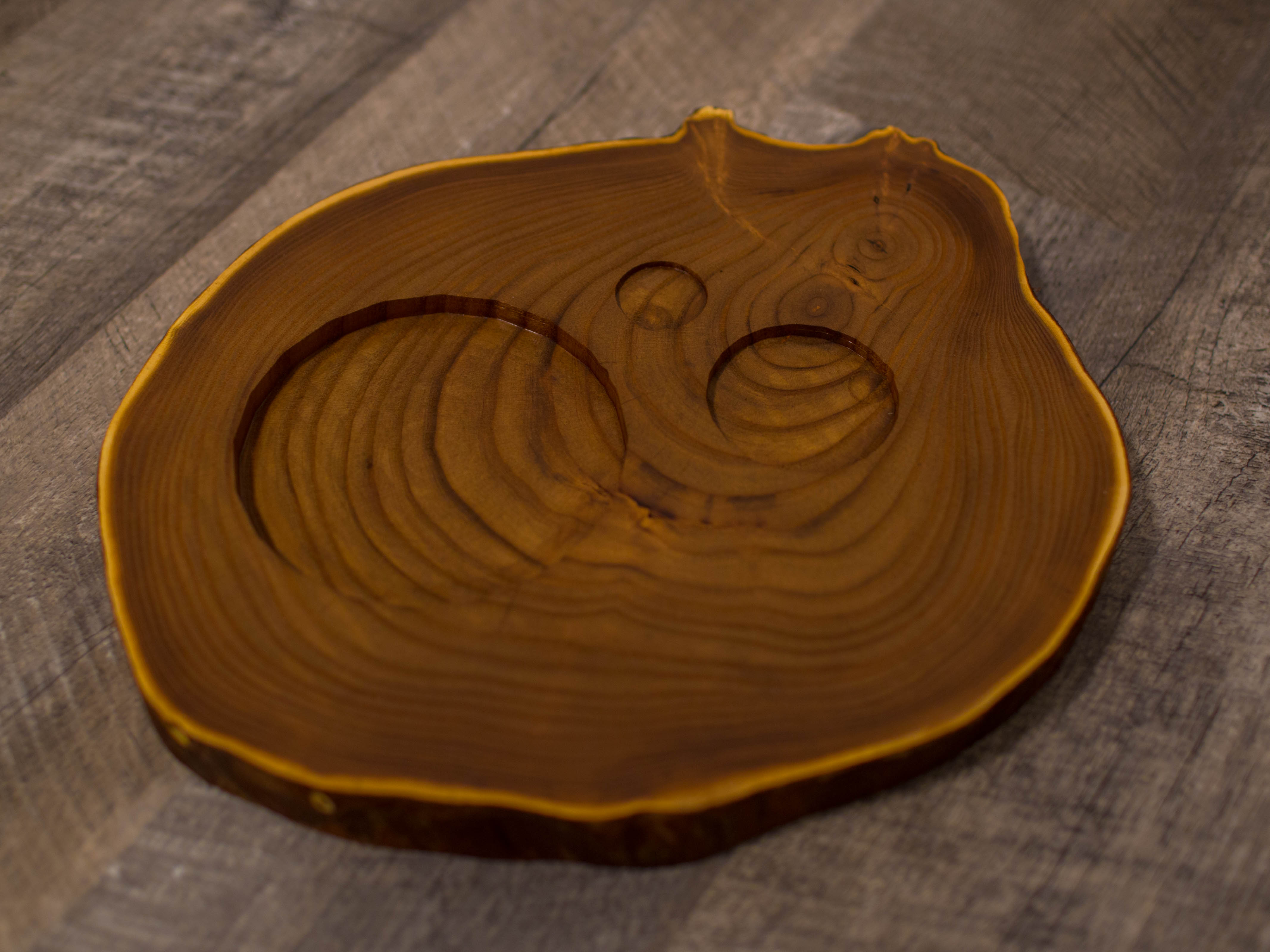 These plates are thick slabs of Russian Olive that my father cut. One side is flat, to be used for any general purpose plating, but the other side has a few wells cut into it, to help compartmentalize various components (such as Protein, Vegetable and Sauce). The wells also fit glasses from my collection.