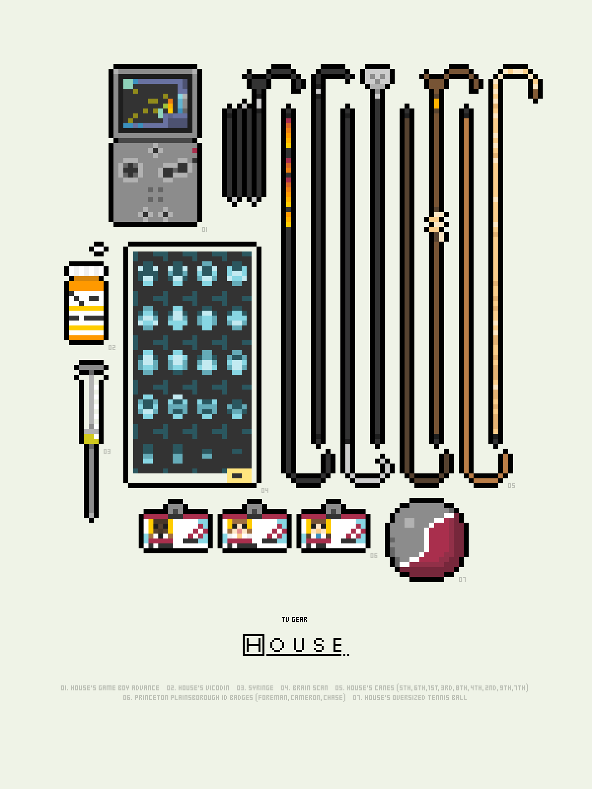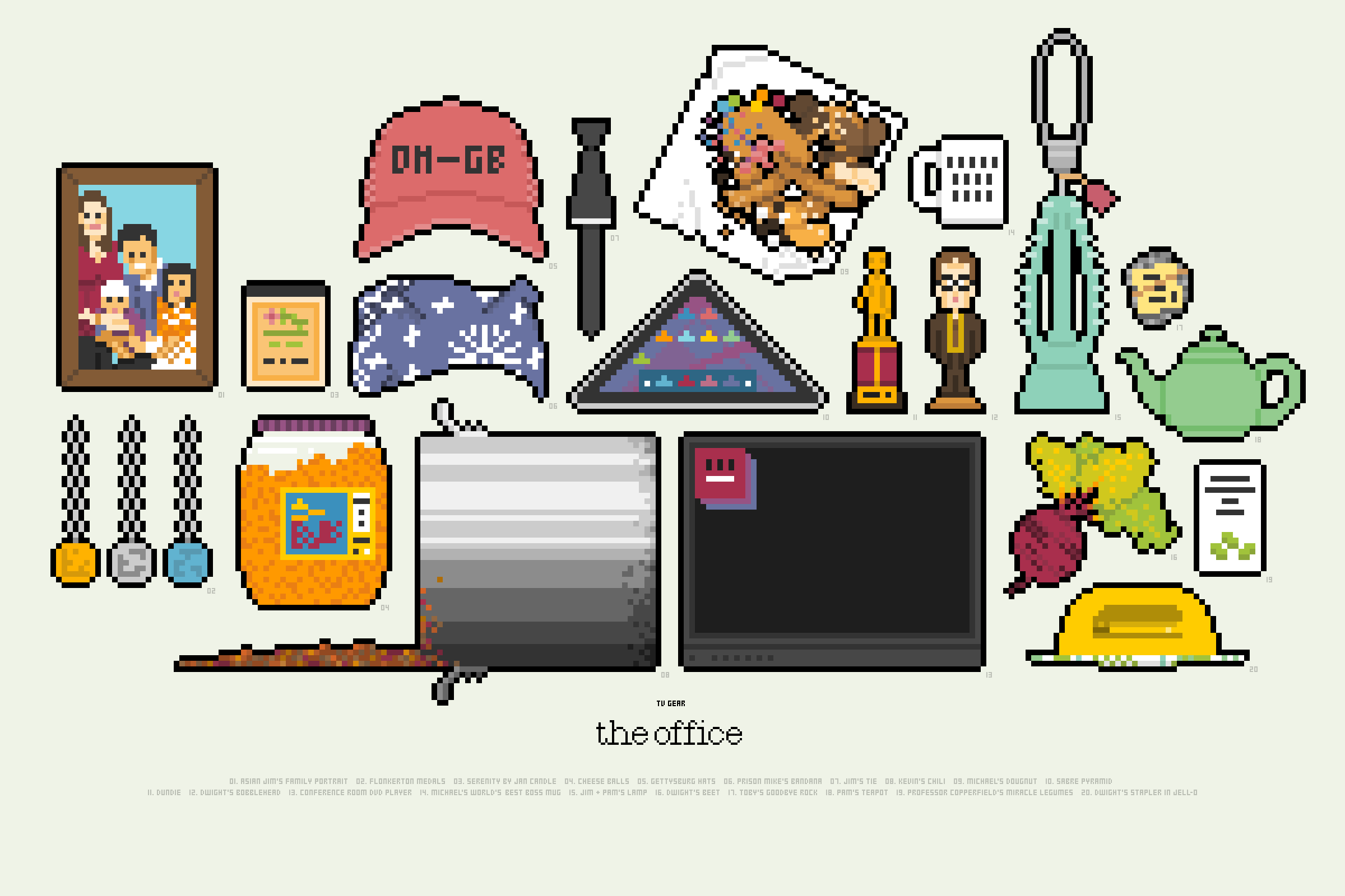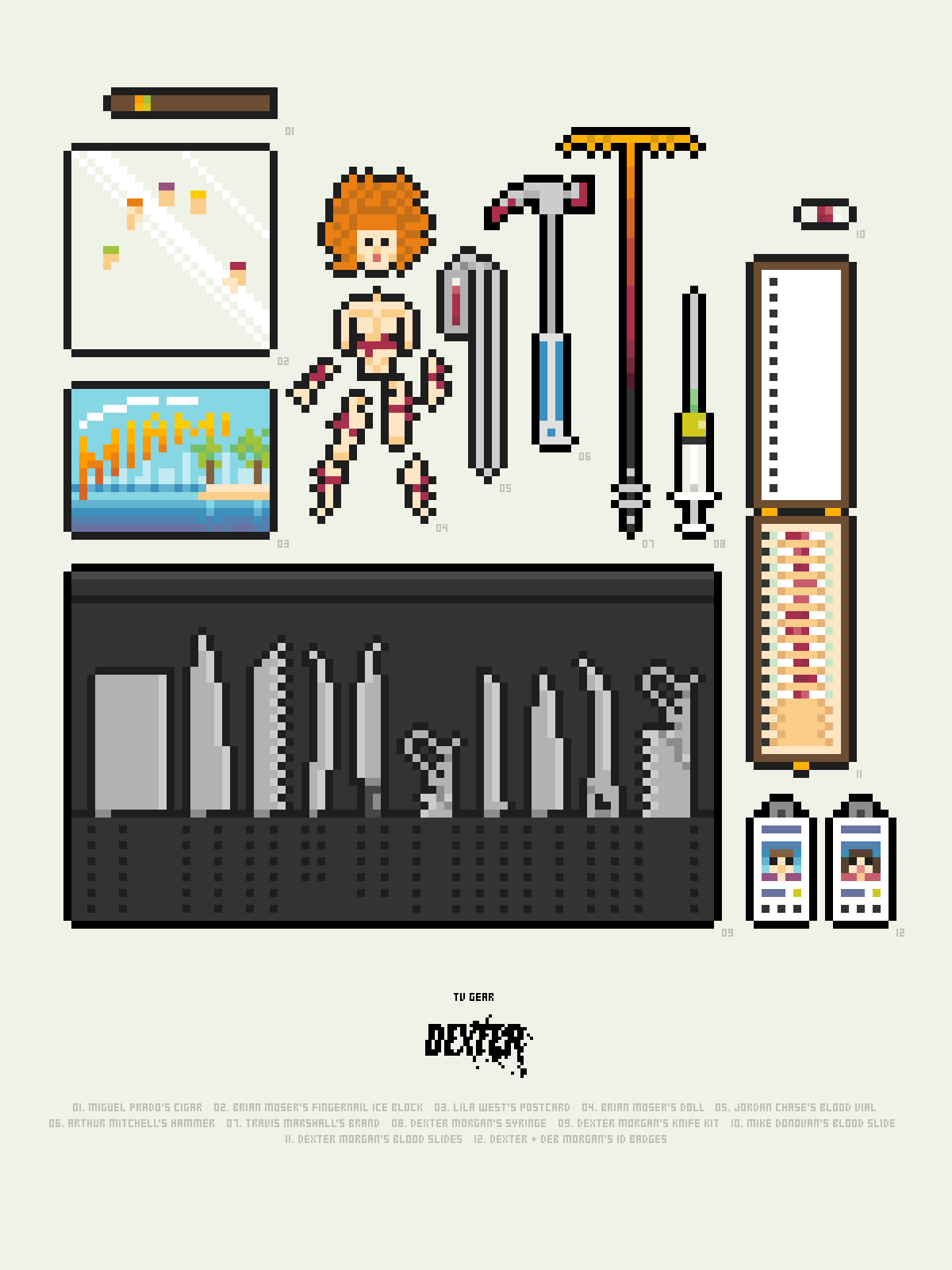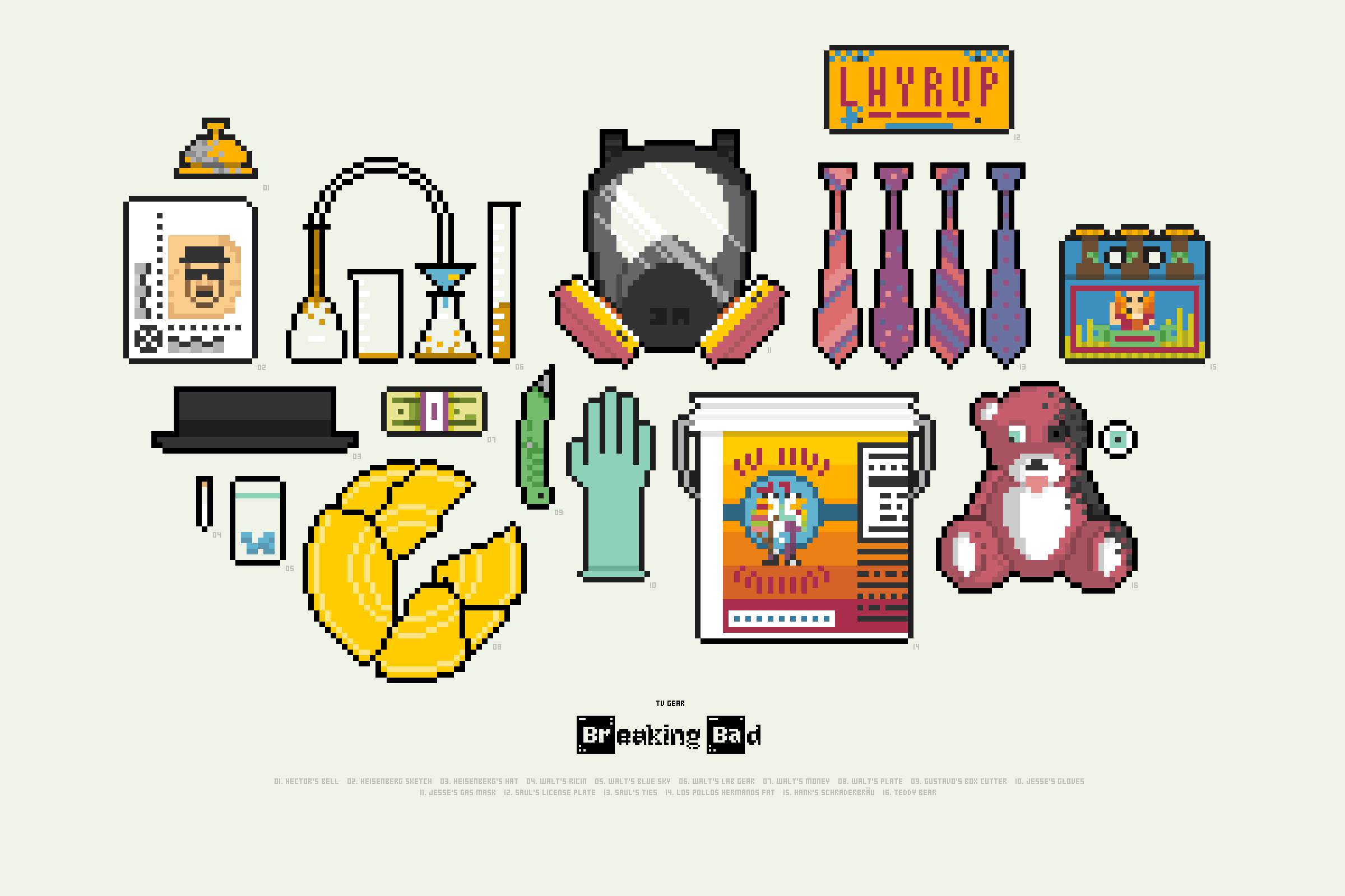This project simply renders iconic and meaningful objects from television in pixel art form. Each poster becomes a little microcosm of character and plot.