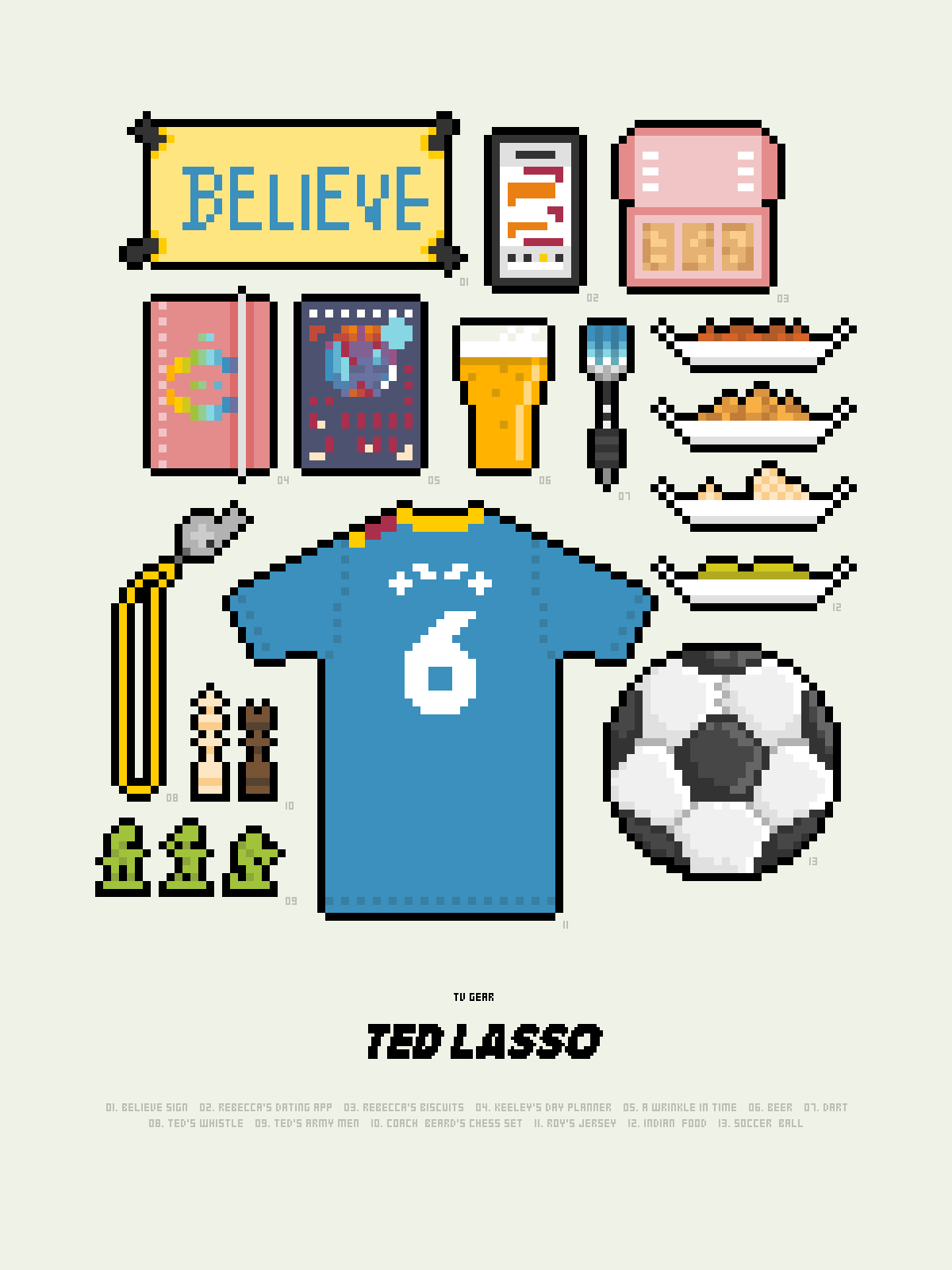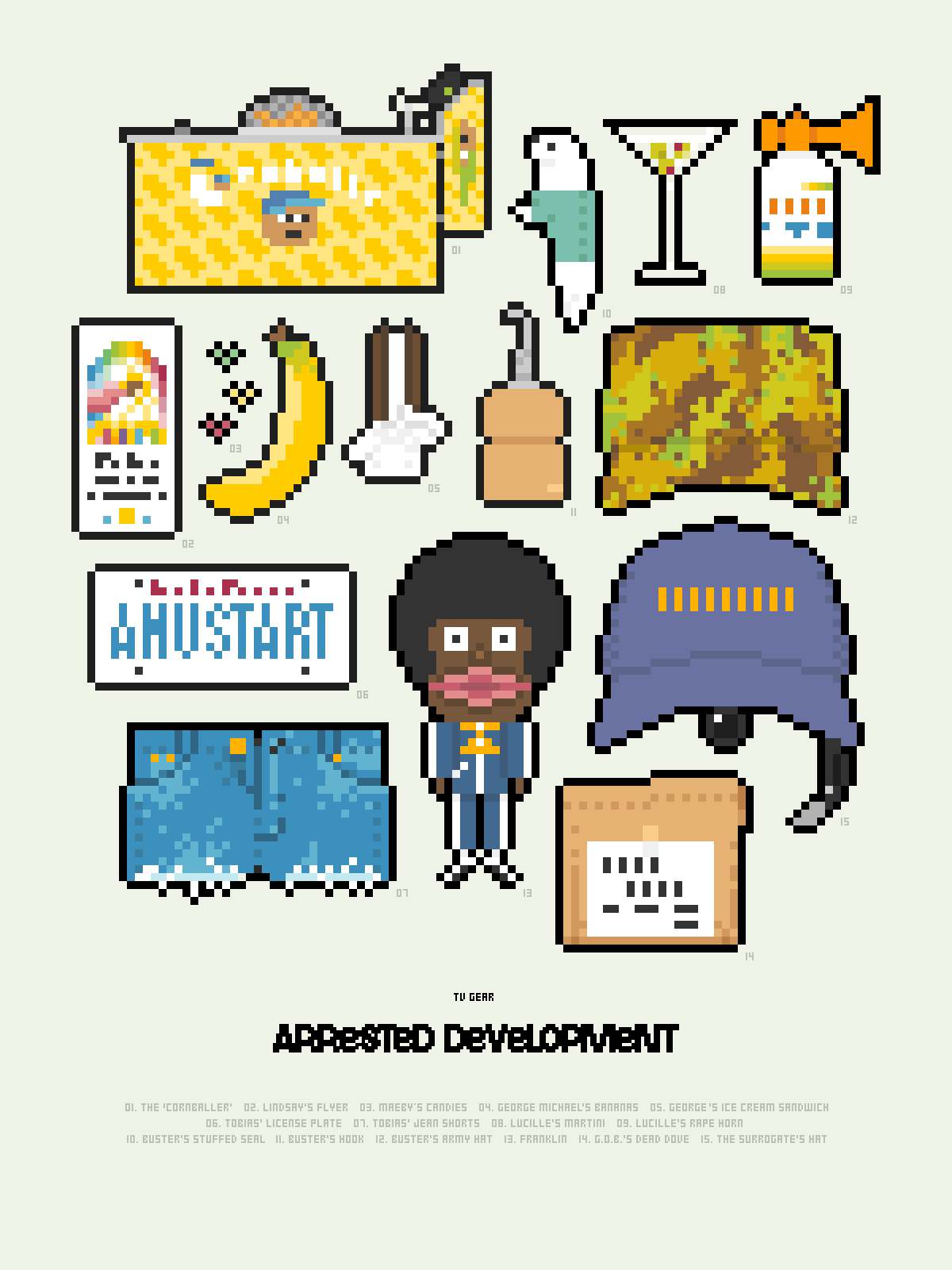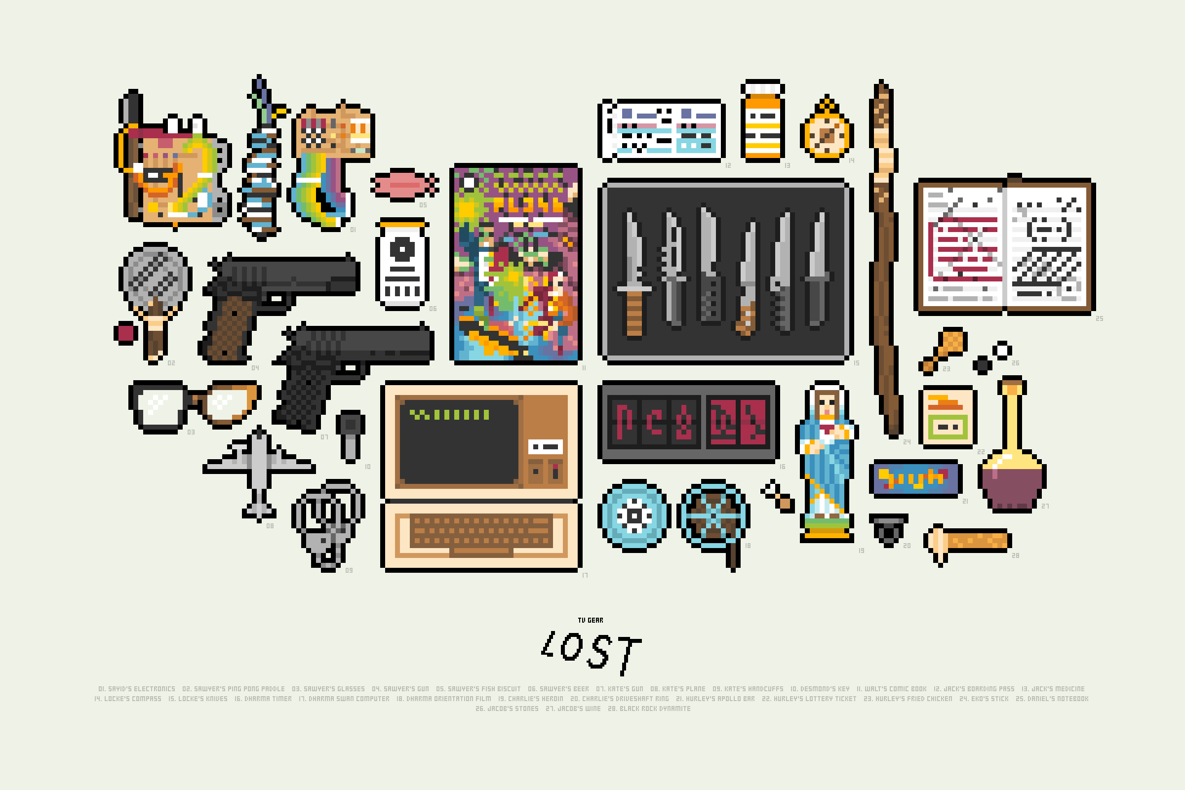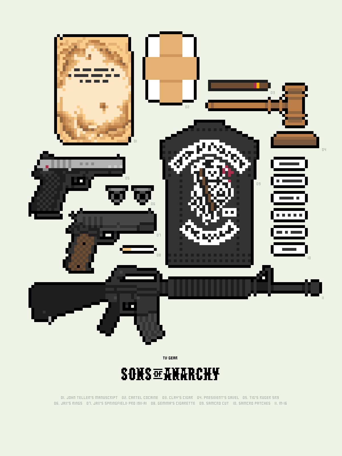 This project simply renders iconic and meaningful objects from television in pixel art form. Each poster becomes a little microcosm of character and plot.