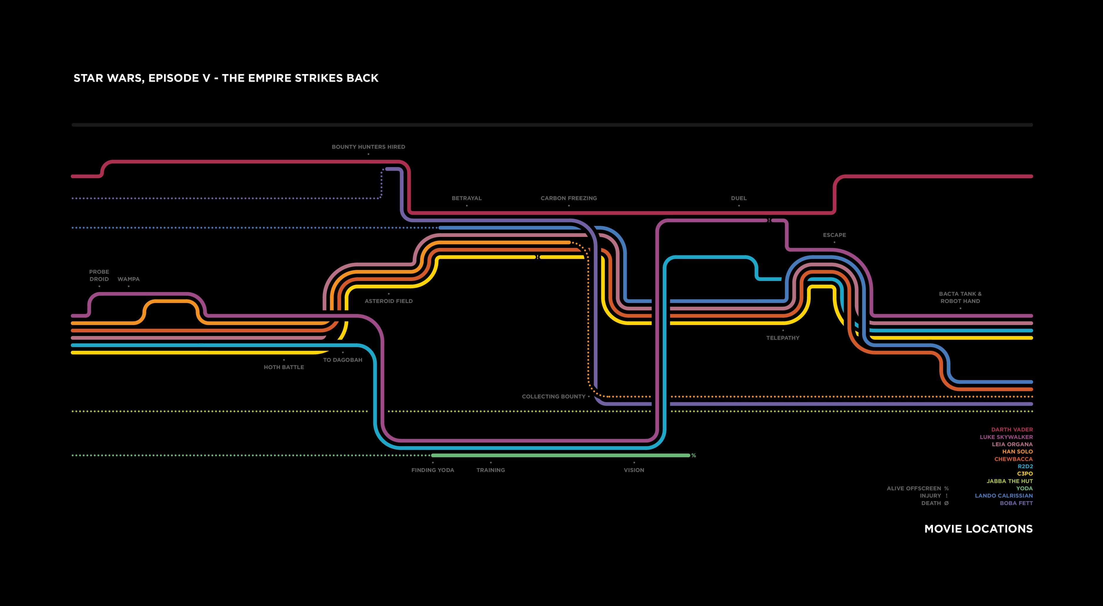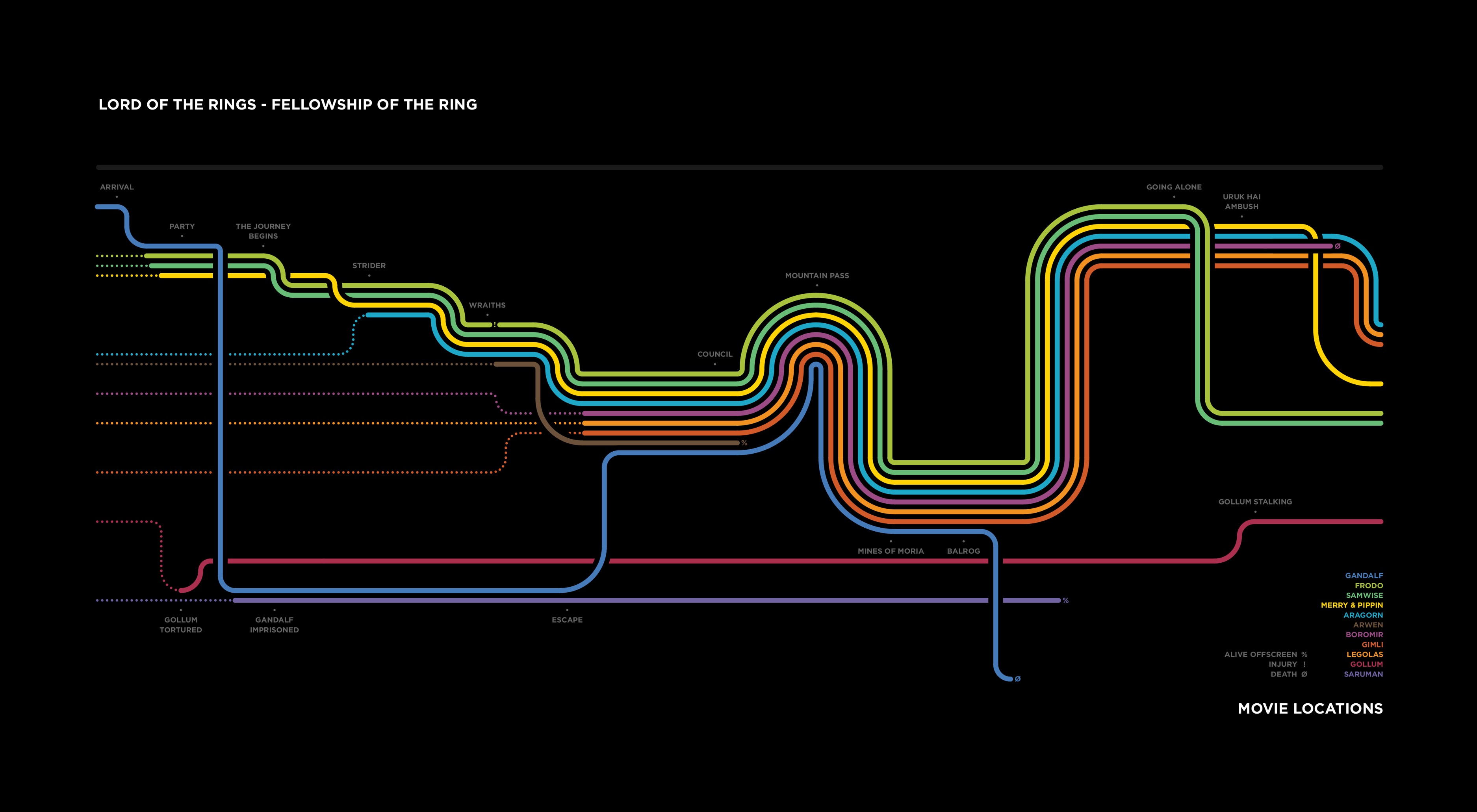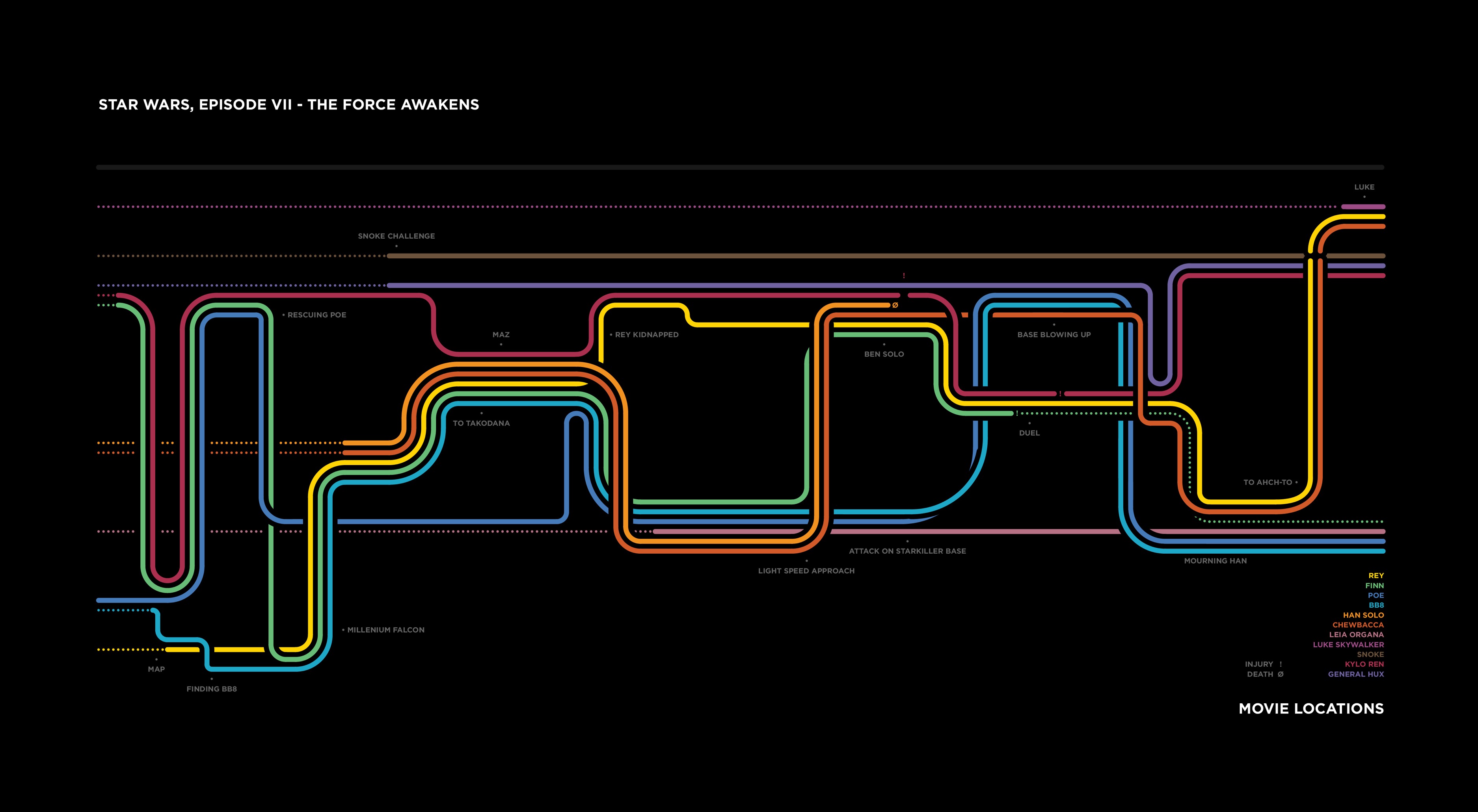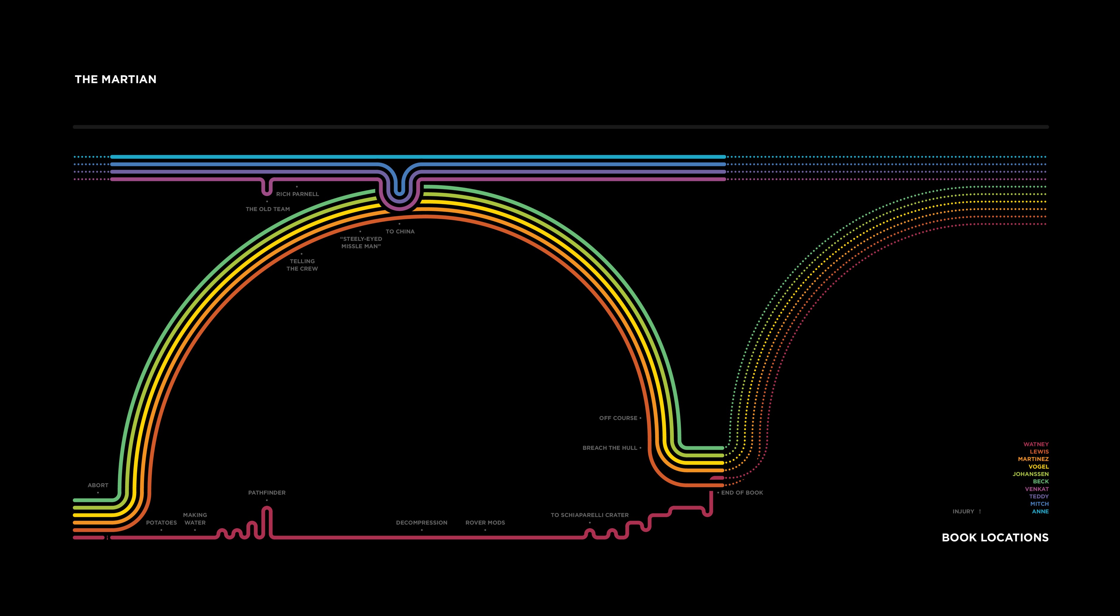 A sibling to Timelines, Locations is about tracking the spatial position of major characters in a movie, book or television series. It's not a map, per se, with absolute locations... but rather an informational illustration of plot mechanics and relative character interactions. By focusing on how characters come together or move apart, these abstract graphic can actually convey many elements of the story. Most stories look and feel reasonably similar in this format, but outliers emerge. Ready Player One has much more rapid character motivations and movement, so the plot tends to more verticality. The Martian, while literally covering more distance than any other, has very few physical character interactions.