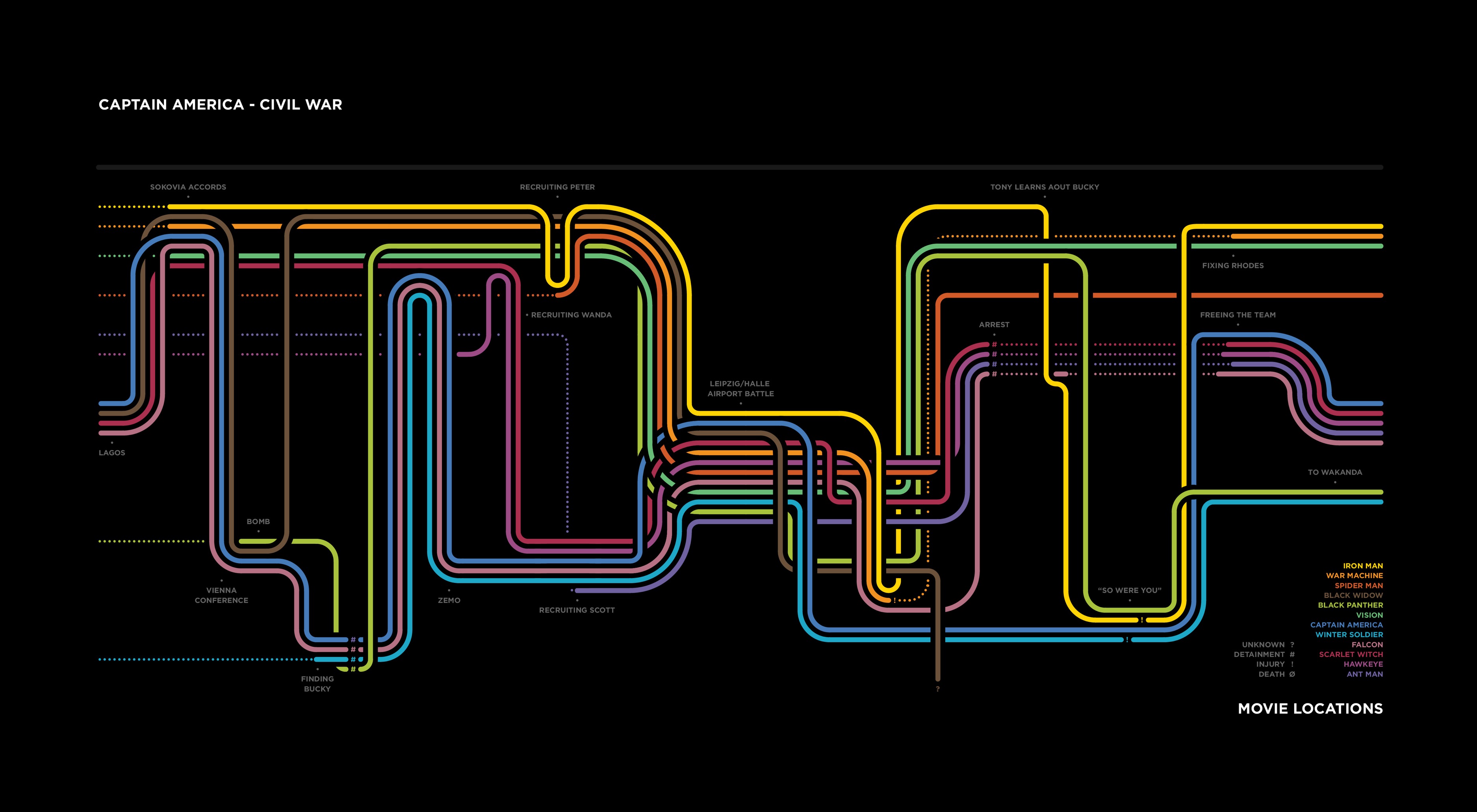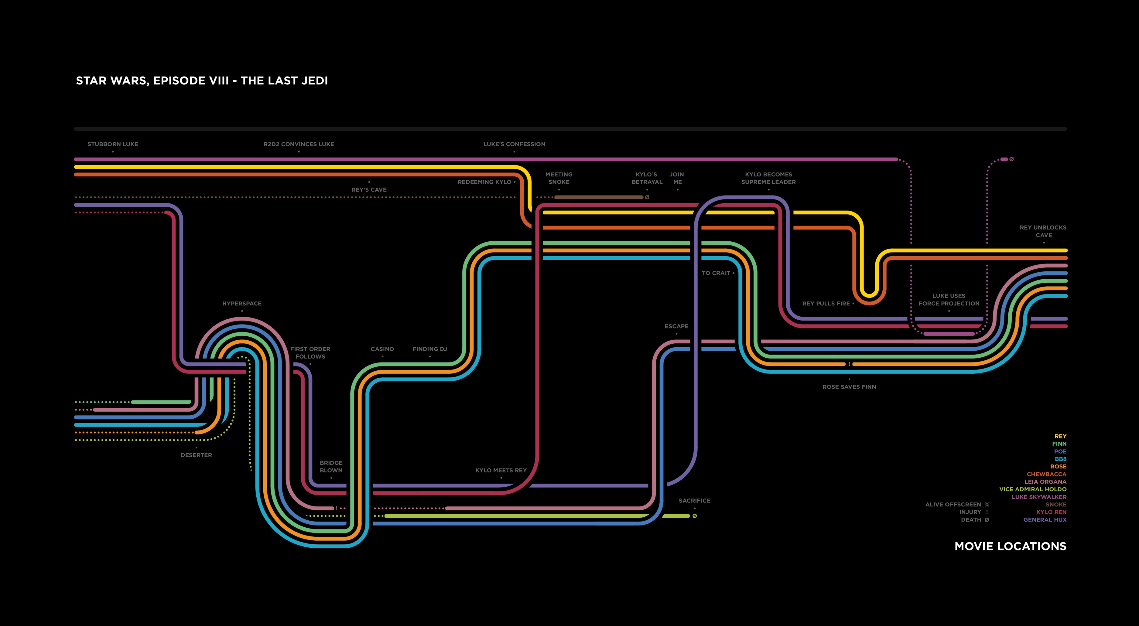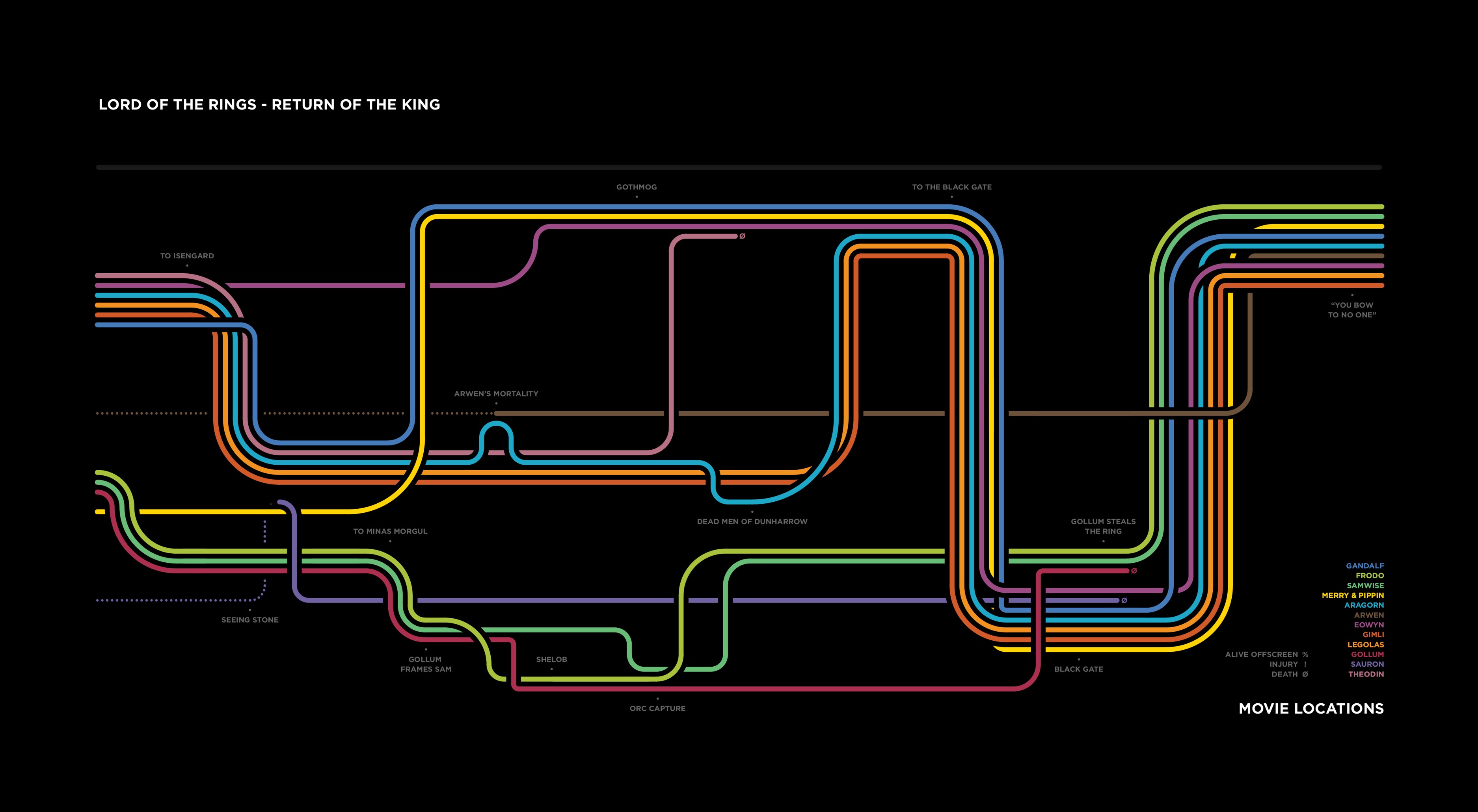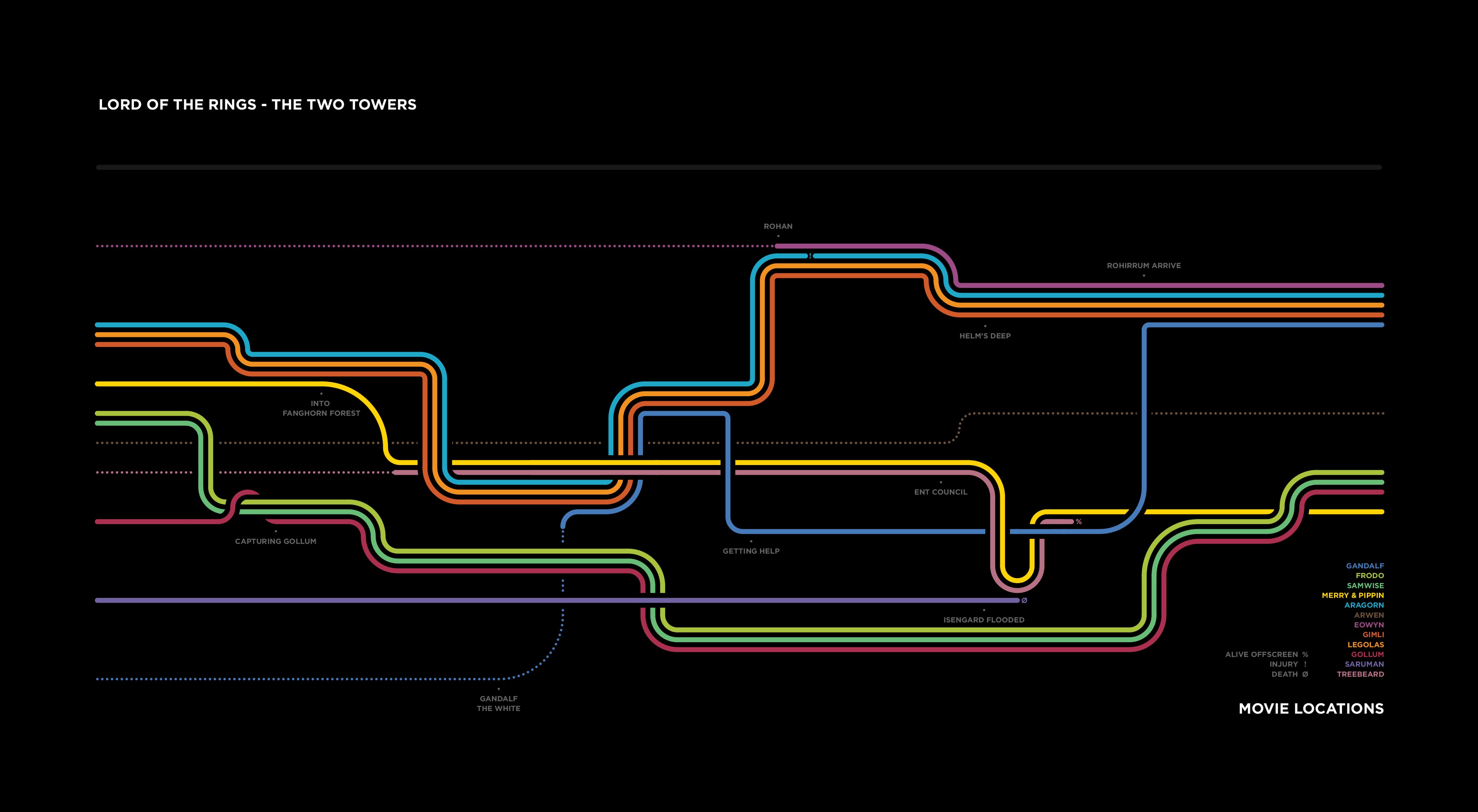 A sibling to Timelines, Locations is about tracking the spatial position of major characters in a movie, book or television series. It's not a map, per se, with absolute locations... but rather an informational illustration of plot mechanics and relative character interactions. By focusing on how characters come together or move apart, these abstract graphic can actually convey many elements of the story. Most stories look and feel reasonably similar in this format, but outliers emerge. Ready Player One has much more rapid character motivations and movement, so the plot tends to more verticality. The Martian, while literally covering more distance than any other, has very few physical character interactions.