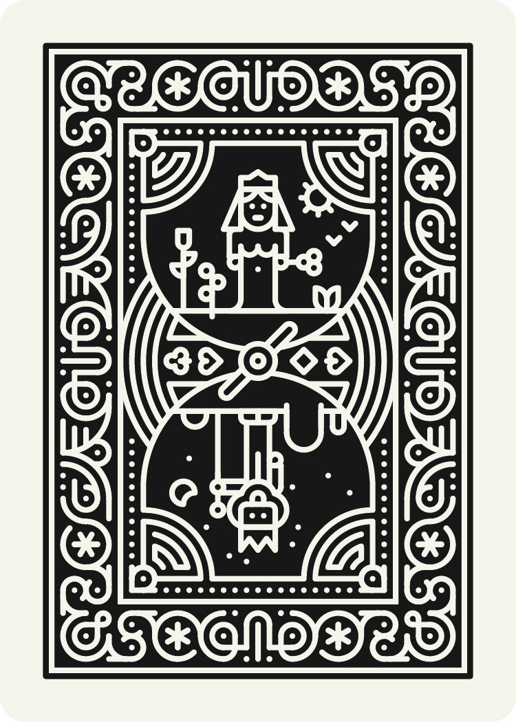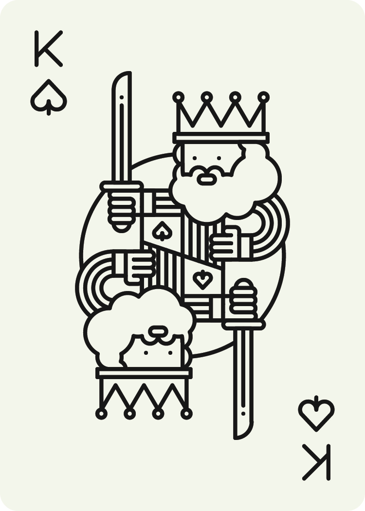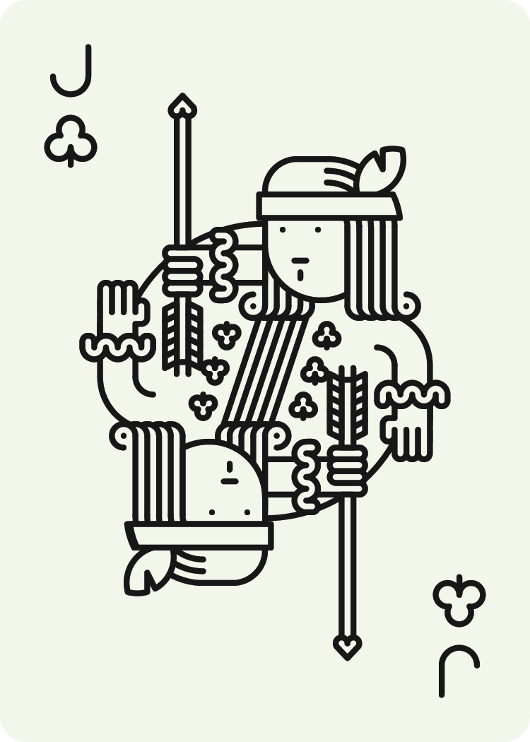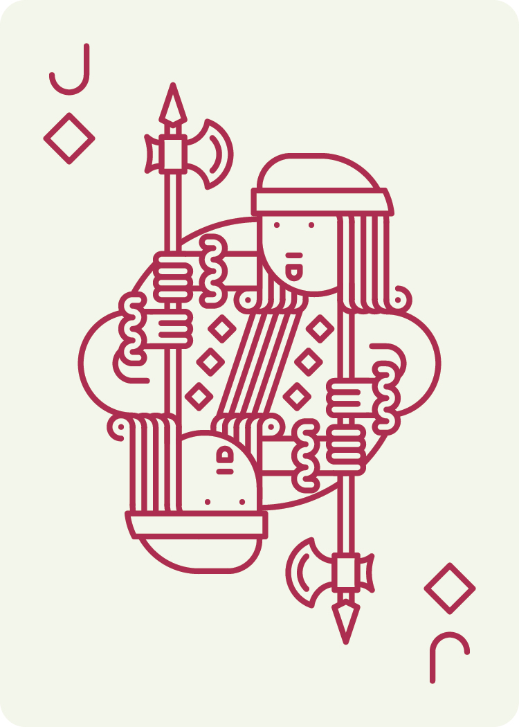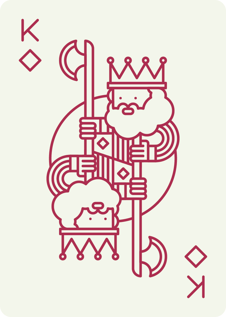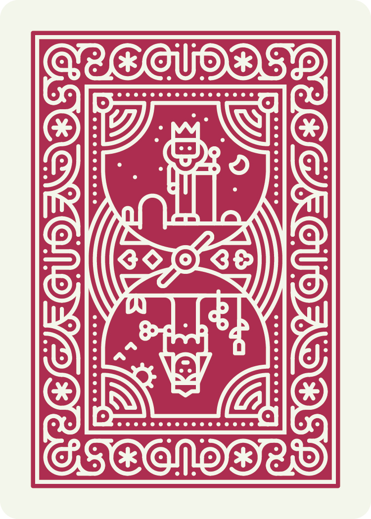 I've been wanting to design my own set of cards for a while. Making the cribbage board was finally the excuse I needed to commit to doing it. These cards use many of the common tropes that have become standard on US card decks - including the royal court and scientific/religious/warfare iconography. I made some modifications to the function of the cards, opting for a non-symmetrical layout for the number cards. This allows both a large and small number corner, which can be useful for different games as well as eyesight levels. The suit count also stacks in the corner so you can use them as a visual aid even in a fanned hand.
